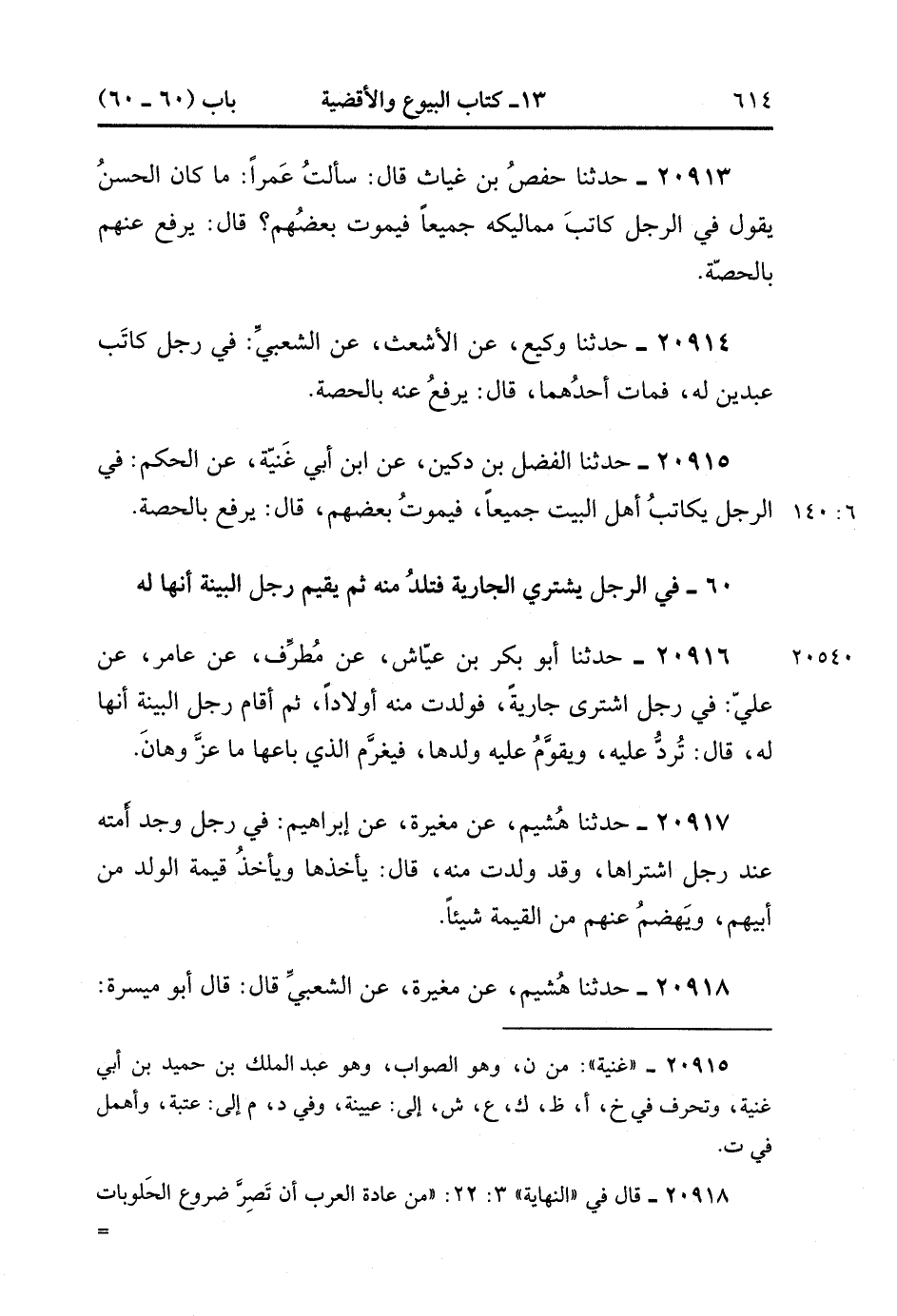 20915- حَدَّثَنَا الْفَضْلُ بْنُ دُكَيْنٍ ، عَنِ ابْنِ أَبِي غَنِيَّةَ ، عَنِ الْحَكَمِ ؛ فِي الرَّجُلِ يُكَاتِبُ أَهْلَ الْبَيْتِ جَمِيعًا فَيَمُوتُ بَعْضُهُمْ ، قَالَ : يَرْفَعُ بِالْحِصَّةِ. (6/139).
