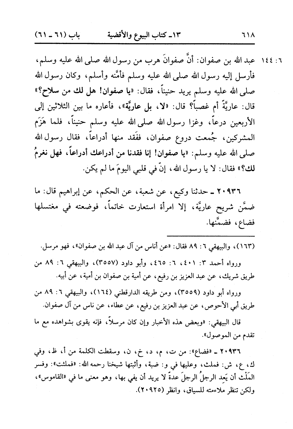 20935- حَدَّثَنَا جَرِيرٌ ، عَنْ عَبْدِ الْعَزِيزِ بْنِ رُفَيْعٍ ، عَنْ أُنَاسٍ مِنْ آلِ عَبْدِ اللهِ بْنِ صَفْوَانَ ، أَنَّ صَفْوَانَ هَرَبَ مِنْ رَسُولِ اللهِ صَلَّى الله عَلَيْهِ وَسَلَّمَ فَأَرْسَلَ إلَيْهِ رَسُولُ اللهِ صَلَّى الله عَلَيْهِ وَسَلَّمَ فأمَّنَهُ وَأَسْلَمَ ، وَكَانَ رَسُولُ اللهِ صَلَّى الله عَلَيْهِ وَسَلَّمَ يُرِيدُ حُنَيْنًا فَقَالَ : يَا صَفْوَانُ ، هَلْ لَكَ مِنْ سِلاَحٍ ؟ قَالَ : عَارِيَّةً أَمْ غَصْبًا ؟ قَالَ : لاَ ، بَلْ عَارِيَّةً ، فَأَعَارَهُ مَا بَيْنَ الثَّلاَثِينَ إلَى الأَرْبَعِينَ دِرْعًا ، وَغَزَا رَسُولُ اللهِ صَلَّى الله عَلَيْهِ وَسَلَّمَ حُنَيْنًا ، فَلَمَّا هَزَمَ المْشركين جُمِعَتْ دُرُوعُ صَفْوَانَ ، فَفَقَدَ مِنْهَا أَدْرَاعًا ، فَقَالَ رَسُولُ اللهِ صَلَّى الله عَلَيْهِ وَسَلَّمَ : يَا صَفْوَانُ ، إنَّا فَقَدْنَا مِنْ أَدْرَاعِكَ أَدْرَاعًا فَهَلْ نَغْرَمُ لَكَ ؟ فَقَالَ : لاَ يَا رَسُولَ اللهِ ، إنَّ فِي قَلْبِي الْيَوْمَ مَا لَمْ يَكُنْ. (6/143).