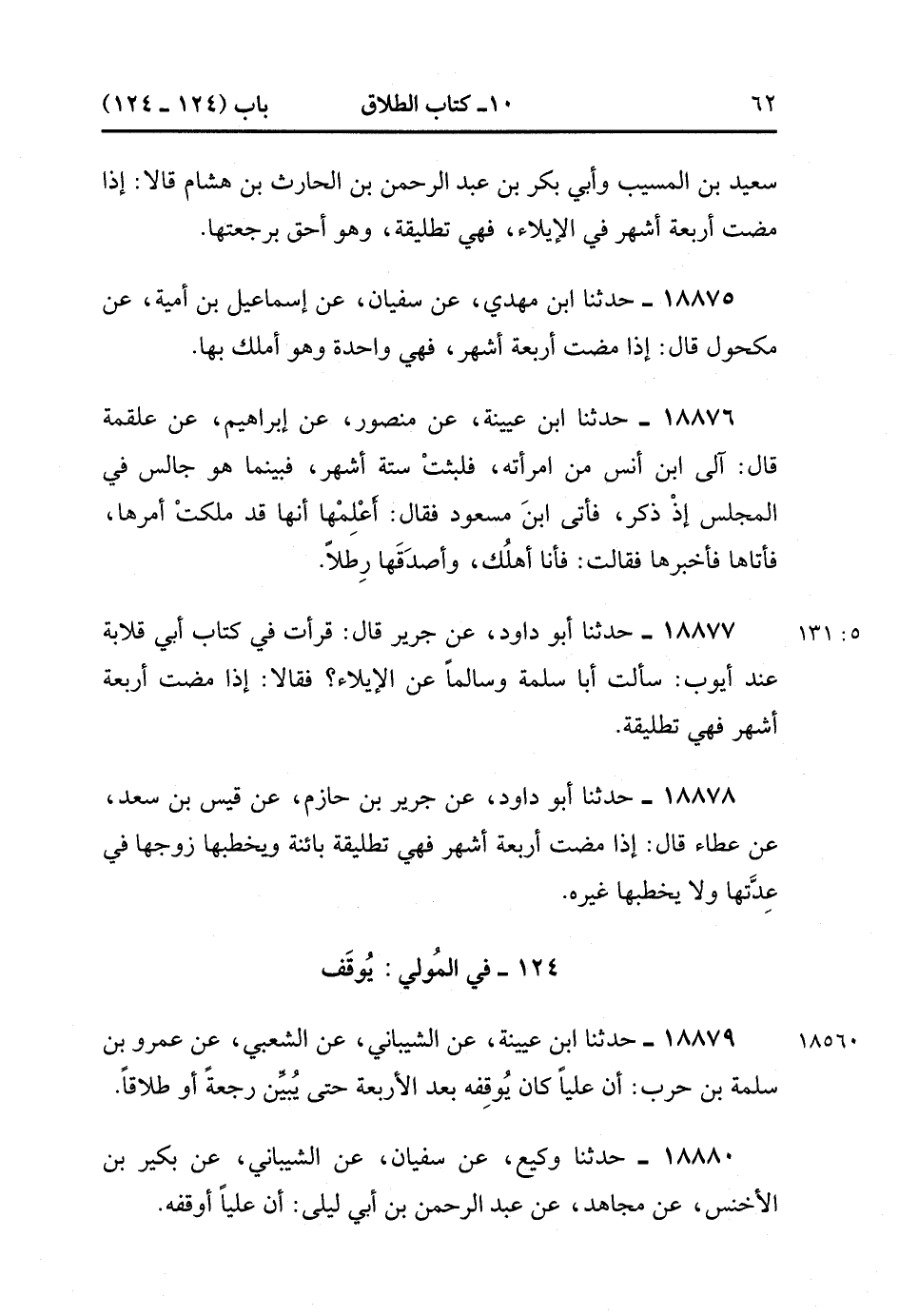 18879- حَدَّثَنَا ابْنُ عُيَيْنَةَ ، عَنِ الشَّيْبَانِيِّ ، عَنِ الشَّعْبِيِّ ، عَنْ عَمْرِو بْنِ سَلِمَةَ بْنِ حَرْبٍ ؛ أَنَّ عَلِيًّا كَانَ يُوقِفُهُ بَعْدَ الأَرْبَعَةِ حَتَّى يُبَيِّنَ رَجْعَةً ، أَوْ طَلاَقًا.