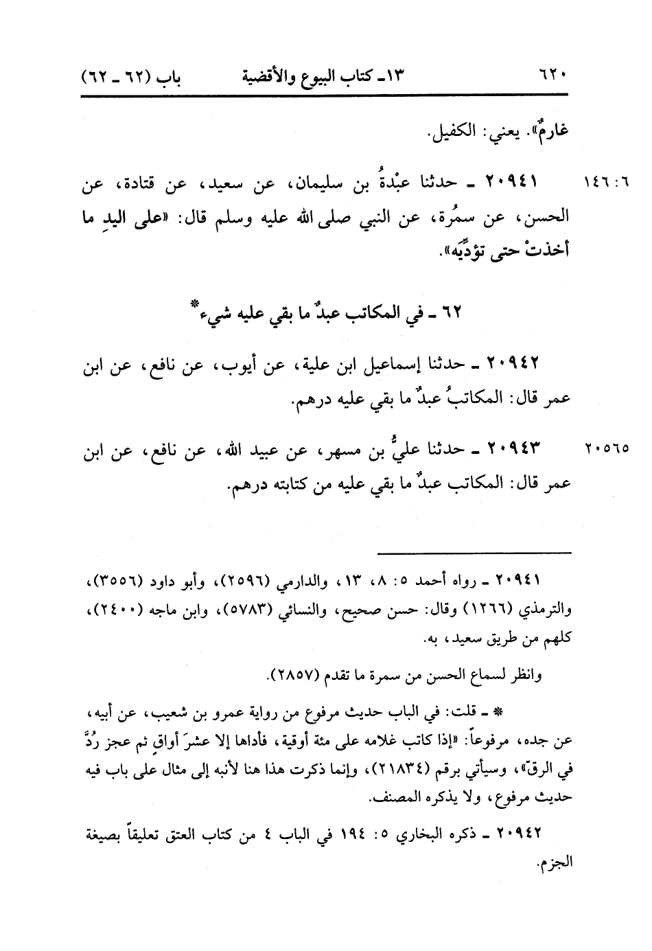 20941- حَدَّثَنَا عَبْدَةُ بْنُ سُلَيْمَانَ ، عَنْ سَعِيدٍ ، عَنْ قَتَادَةَ ، عَنِ الْحَسَنِ ، عَنْ سَمُرَةَ ، عَنِ النَّبِيِّ صَلَّى الله عَلَيْهِ وَسَلَّمَ ، قَالَ : عَلَى الْيَدِ مَا أَخَذَتْ حَتَّى تُؤَدِّيَهُ.
