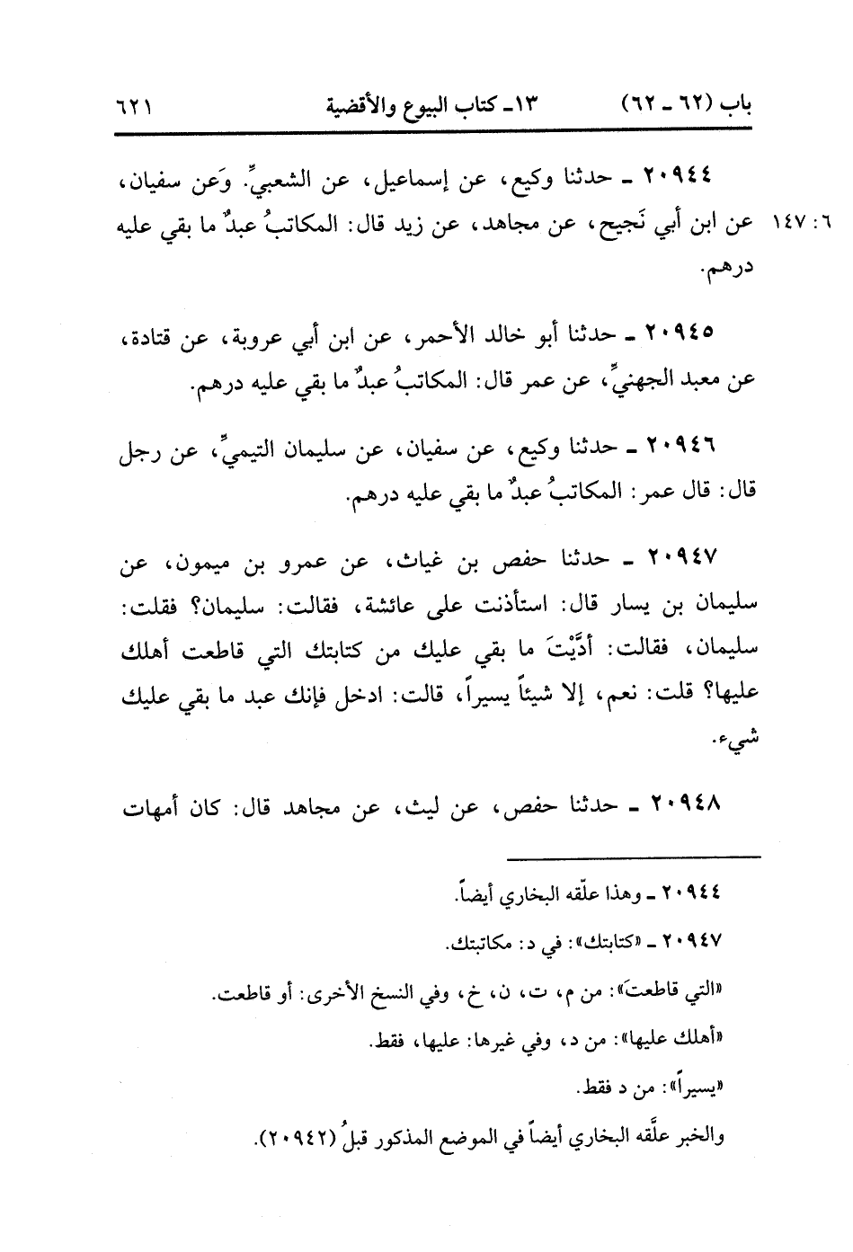 20944- حَدَّثَنَا وَكِيعٌ ، عَنْ إسْمَاعِيلَ ، عَنِ الشَّعْبِيِّ , وَعَنْ سُفْيَانَ ، عَنِ ابْنِ أَبِي نَجِيحٍ ، عَنْ مُجَاهِدٍ ، عَنْ زَيْدٍ ، قَالَ : قَالَ : الْمُكَاتَبُ عَبْدٌ مَا بَقِيَ عَلَيْهِ دِرْهَمٌ. (6/146).