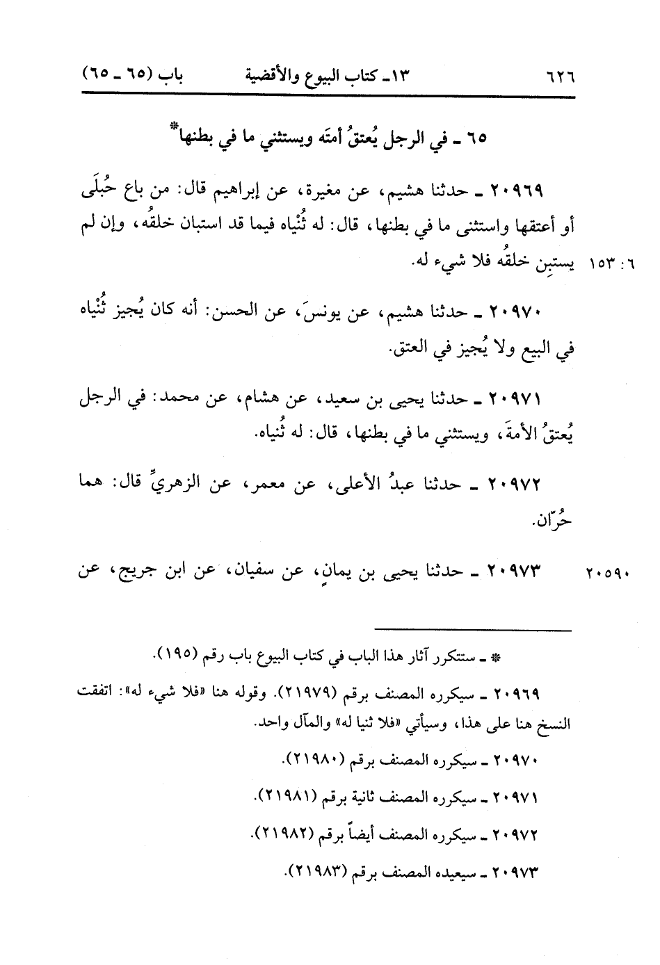 20969- حَدَّثَنَا هُشَيْمٌ ، عَنْ مُغِيرَةَ ، عَنْ إبْرَاهِيمَ ، قَالَ : مَنْ بَاعَ حُبْلَى ، أَوْ أَعْتَقَهَا وَاسْتَثْنَى مَا فِي بَطْنِهَا ، قَالَ لَهُ : ثُنْيَاهُ فِيمَا قَدَ اسْتَبَانَ خَلْقُهُ ، وَإِنْ لَمْ يَسْتَبِنْ خَلْقُهُ فَلاَ شَيْءَ لَهُ. (6/152).