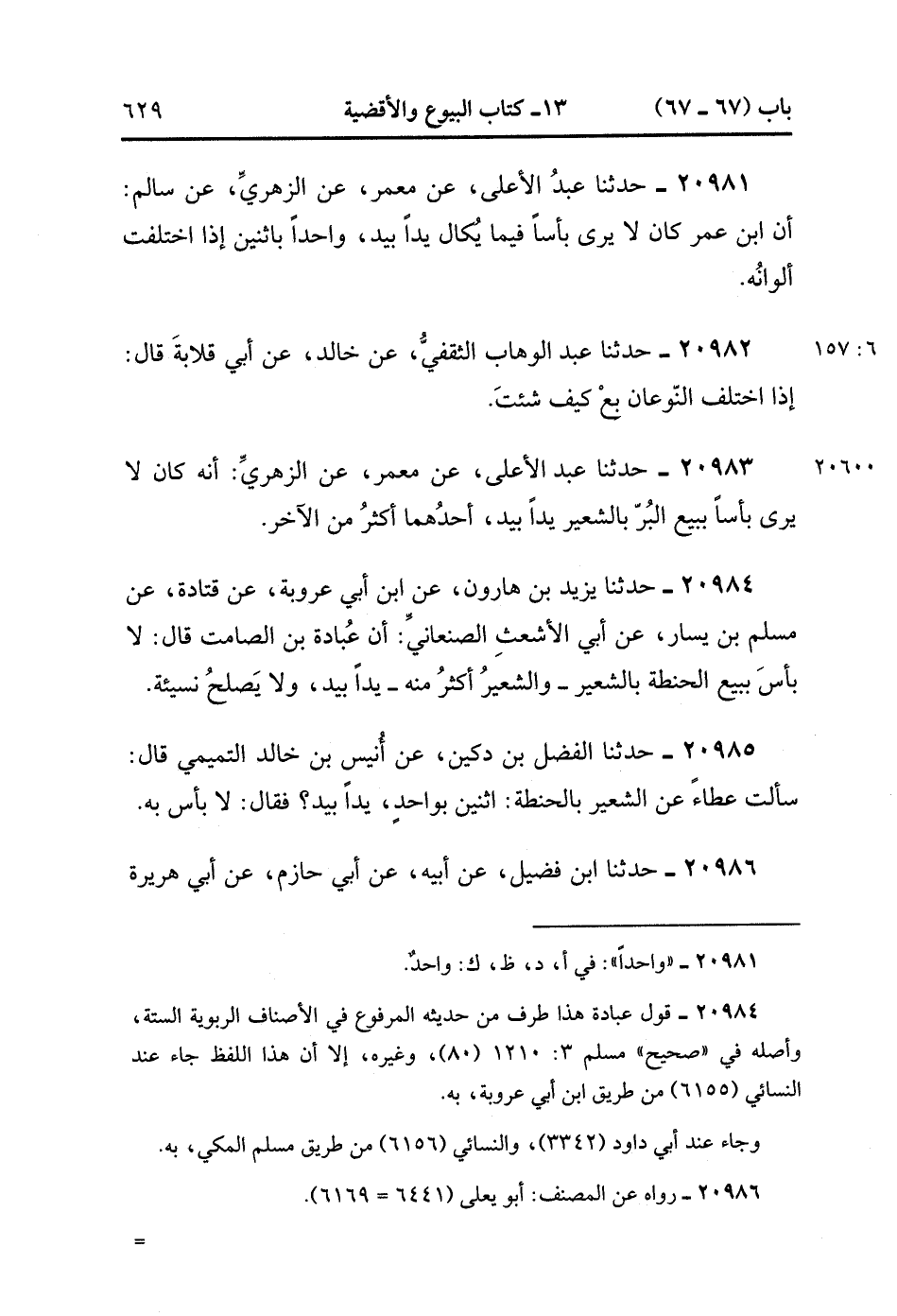 20985- حَدَّثَنَا الْفَضْلُ بْنُ دُكَيْنٍ ، عَنْ أُنَيْسِ بْنِ خَالِدٍ التَّمِيمِيِّ ، قَالَ : سَأَلْتُ عَطَاءً عَنِ الشَّعِيرِ بِالْحِنْطَةِ اثْنَيْنِ بِوَاحِدٍ يَدًا بِيَدٍ ، فقَالَ : لاَ بَأْسَ بِهِ. (6/157).