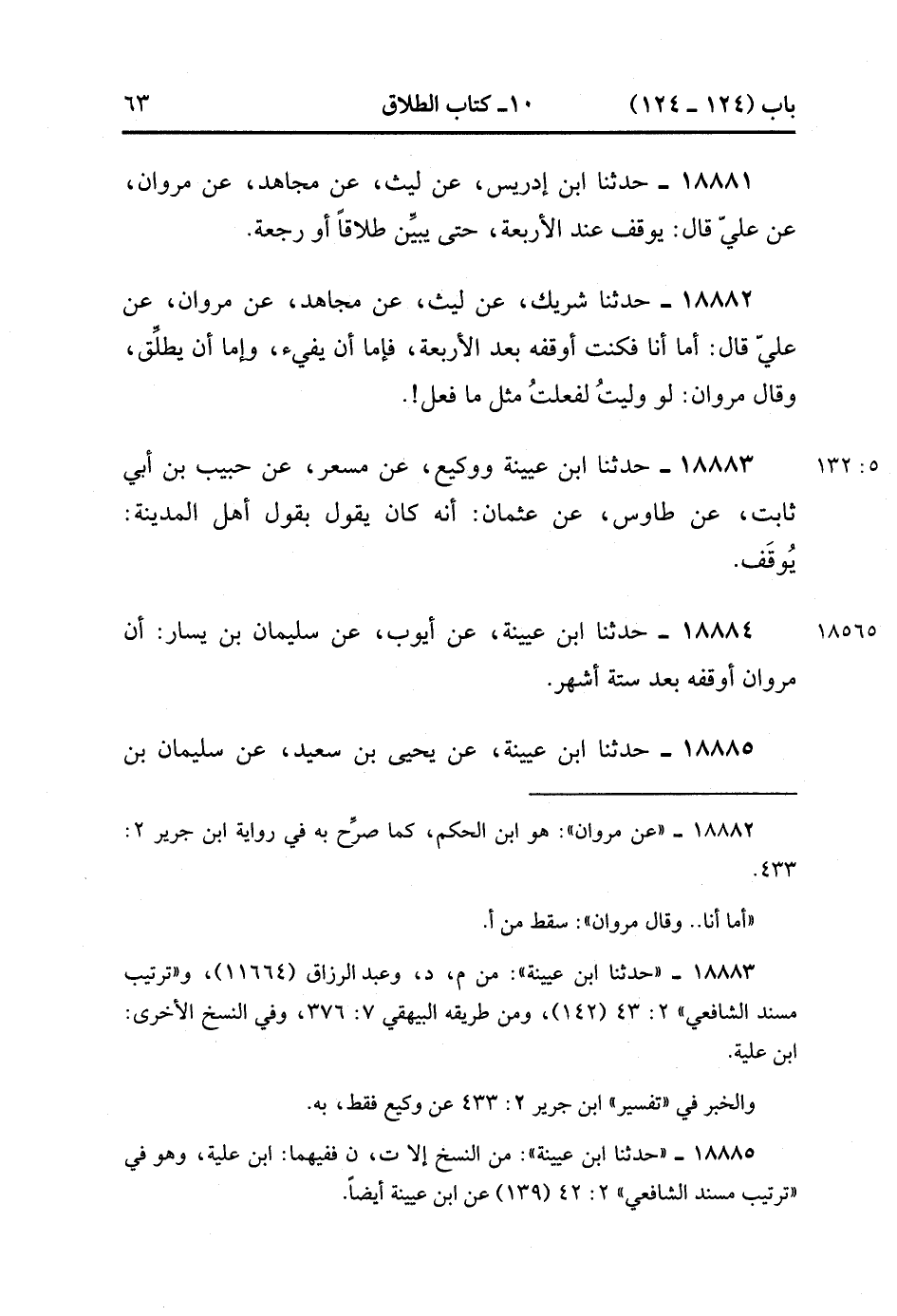 18881- حَدَّثَنَا ابْنُ إدْرِيسَ ؛ عَنْ لَيْثٍ ، عَنْ مُجَاهِدٍ ، عَنْ مَرْوَانَ ، عَنْ عَلِيٍّ ، قَالَ : يُوقَفُ عِنْدَ الأَرْبَعَةِ حَتَّى يُبَيِّنَ طَلاَقًا ، أَوْ رَجْعَةً.