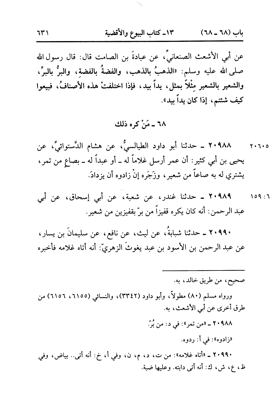 20988- حَدَّثَنَا أَبُو دَاوُدَ الطَّيَالِسِيُّ ، عَنْ هِشَامٍ الدَّسْتُوَائِيِّ ، عَنْ يَحْيَى بْنِ أَبِي كَثِيرٍ ، أَنَّ عُمَرَ أَرْسَلَ غُلاَمًا لَهُ ، أَوْ عَبْدًا لَهُ بِصَاعٍ مِنْ تمر يَشْتَرِي لَهُ بِهِ صَاعًا مِنْ شَعِيرٍ ، وَزَجَرَهُ إِنْ زَادُوهُ أَنْ يَزْدَادَ. (6/158).