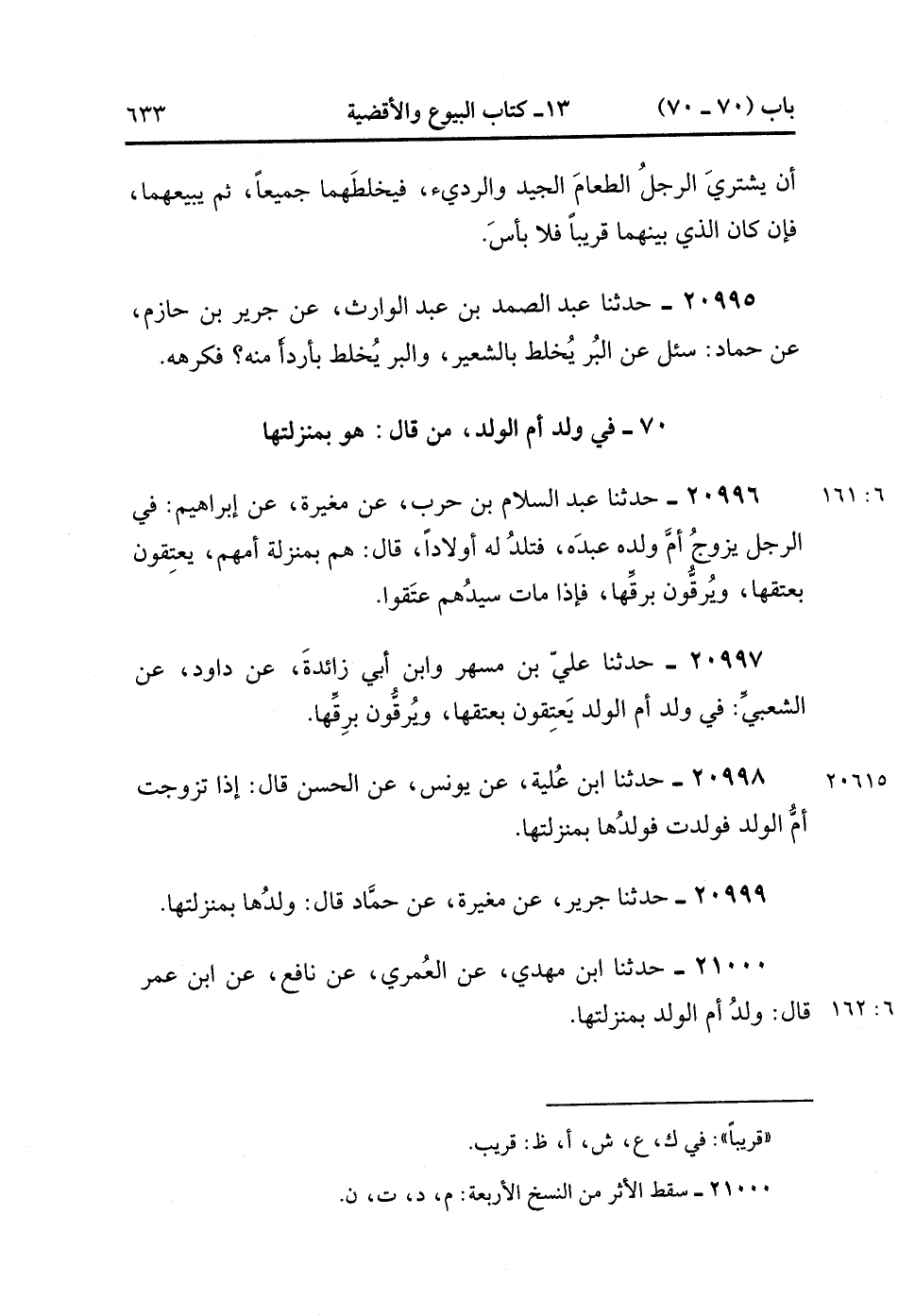 21000- حَدَّثَنَا ابْنُ مَهْدِيٍّ ، عَنِ الْعُمَرِيِّ ، عَنْ نَافِعٍ ، عَنِ ابْنِ عُمَرَ ، قَالَ : وَلَدُ أُمِّ الْوَلَدِ بِمَنْزِلَتِهَا. (6/161).