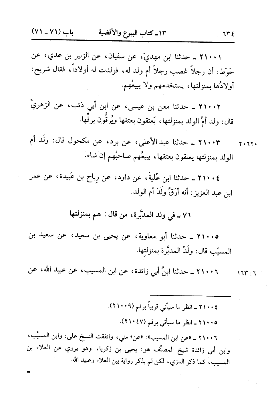 21006- حَدَّثَنَا ابْنُ أَبِي زَائِدَةَ ، عَنِ ابْنِ الْمُسَيَّبِ ، عَنْ عُبَيْدِ اللهِ ، عَنْ نَافِعٍ ، عَنِ ابْنِ عُمَرَ ، قَالَ : وَلَدُ الْمُعْتَقَةِ ، عَنْ دُبُرٍ مِنْهَا يُرَقُّونَ بِرِقِّهَا وَيَعْتِقُونَ بِعِتْقِهَا. (6/163).