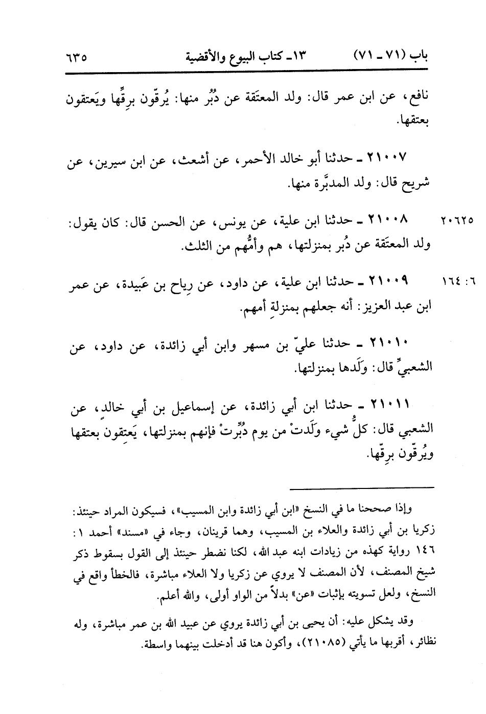 21011- حَدَّثَنَا ابْنُ أَبِي زَائِدَةَ ، عَنْ إسْمَاعِيلَ بْنِ أَبِي خَالِدٍ ، عَنِ الشَّعْبِيِّ ، قَالَ : كُلُّ شَيْءٍ وَلَدَتْ مِنْ يَوْمِ دُبِّرَتْ فَإِنَّهُمْ بِمَنْزِلَتِهَا ، يَعْتِقُونَ بِعِتْقِهَا وَيُرَقُّونَ بِرِقِّهَا. (6/164).
