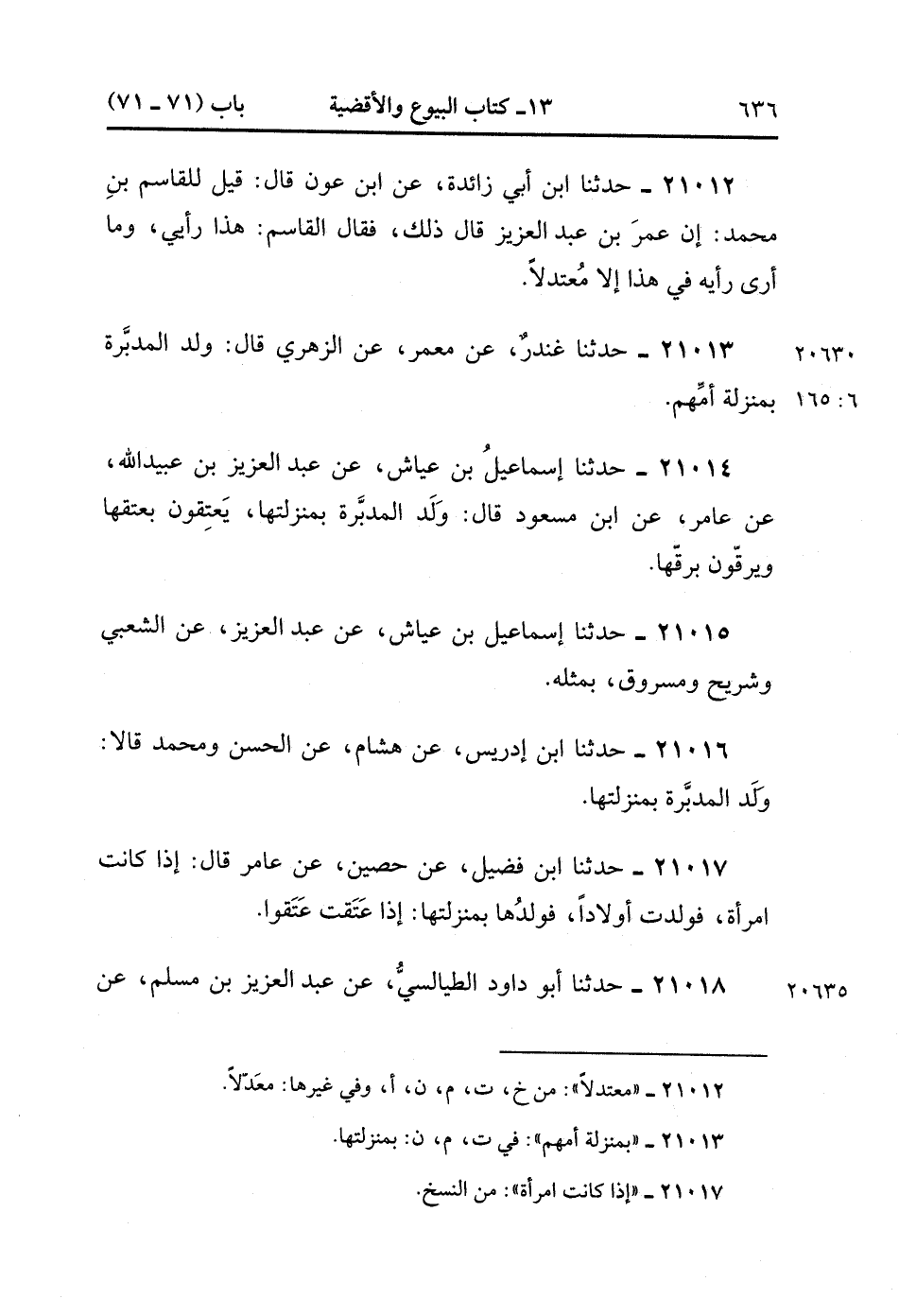 21018- حَدَّثَنَا أَبُو دَاوُدَ الطَّيَالِسِيُّ ، عَنْ عَبْدِ الْعَزِيزِ بْنِ مُسْلِمٍ ، عَنِ ابْنِ أَبِي نَجِيحٍ ، عَنْ عَطَاءٍ وَطَاوُوسٍ ، وَمُجَاهِدٍ ، وَسَعِيدِ بْنِ جُبَيْرٍ أَنَّهُمْ قَالُوا : وَلَدُ الْمُدَبَّرَةِ بِمَنْزِلَةِ أُمِّهِمْ. (6/165).