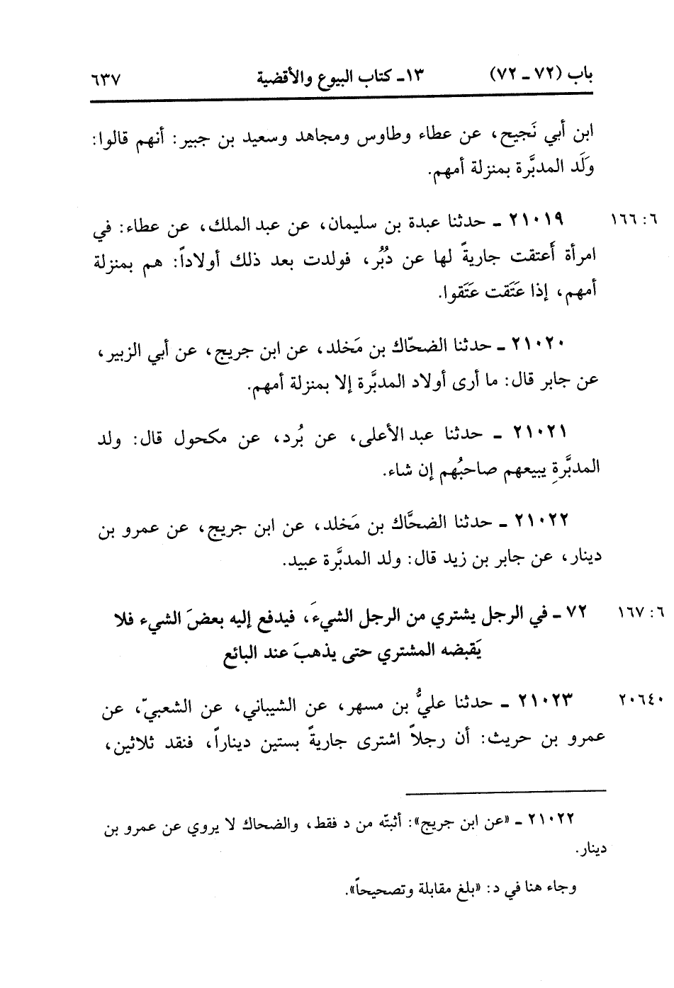 21022- حَدَّثَنَا الضَّحَّاكُ بْنُ مَخْلَدٍ ، عَنْ عَمْرِو بْنِ دِينَارٍ ، عَنْ جَابِرِ بْنِ زَيْدٍ ، قَالَ : وَلَدُ الْمُدَبَّرَةِ عبيد. (6/166).
