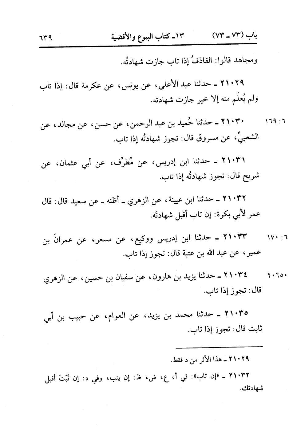 21032- حَدَّثَنَا ابْنُ عُيَيْنَةَ ، عَنِ الزُّهْرِيِّ أَظُنُّهُ ، عَنْ سَعِيدٍ ، قَالَ : قَالَ عُمَرُ لأَِبِي بَكْرَةَ : إِنْ تابْ أَقْبَلْ شَهَادَتَهُ. (6/169).