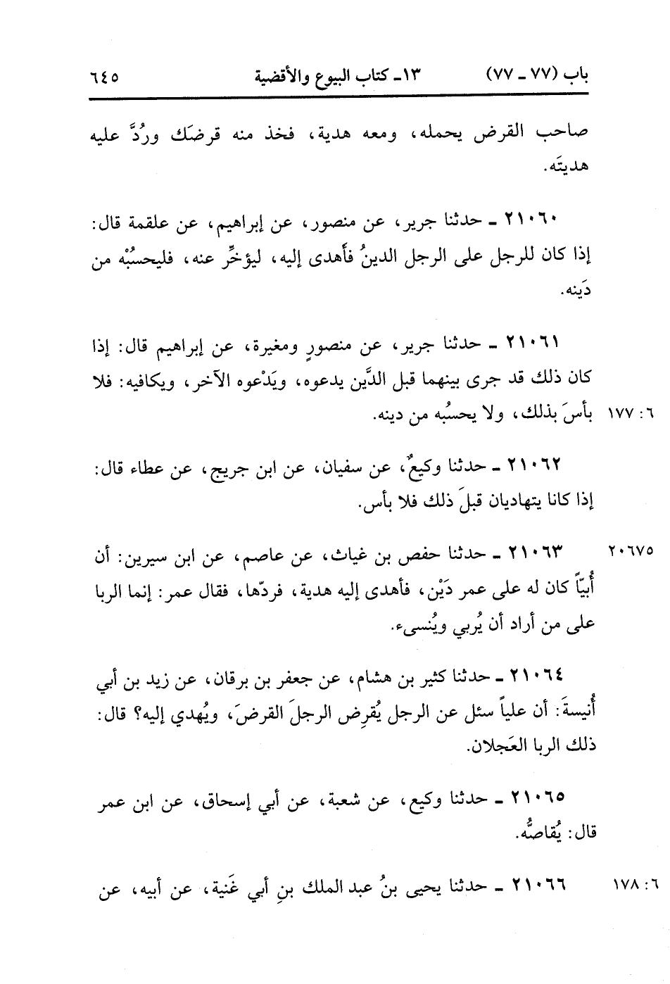 21064- حَدَّثَنَا كَثِيرُ بْنُ هِشَامٍ ، عَنْ جَعْفَرِ بْنِ بُرْقَانَ ، عَنْ زَيْدِ بْنِ أَبِي أُنَيْسَةَ ، أَنَّ عَلِيًّا سُئِلَ عَنِ الرَّجُلِ يَقْرِضُ الرَّجُلَ الْقَرْضَ وَيُهْدِي إلَيْهِ ، قَالَ : ذَلِكَ الرِّبَا الْعَجْلاَنُ (6/177).