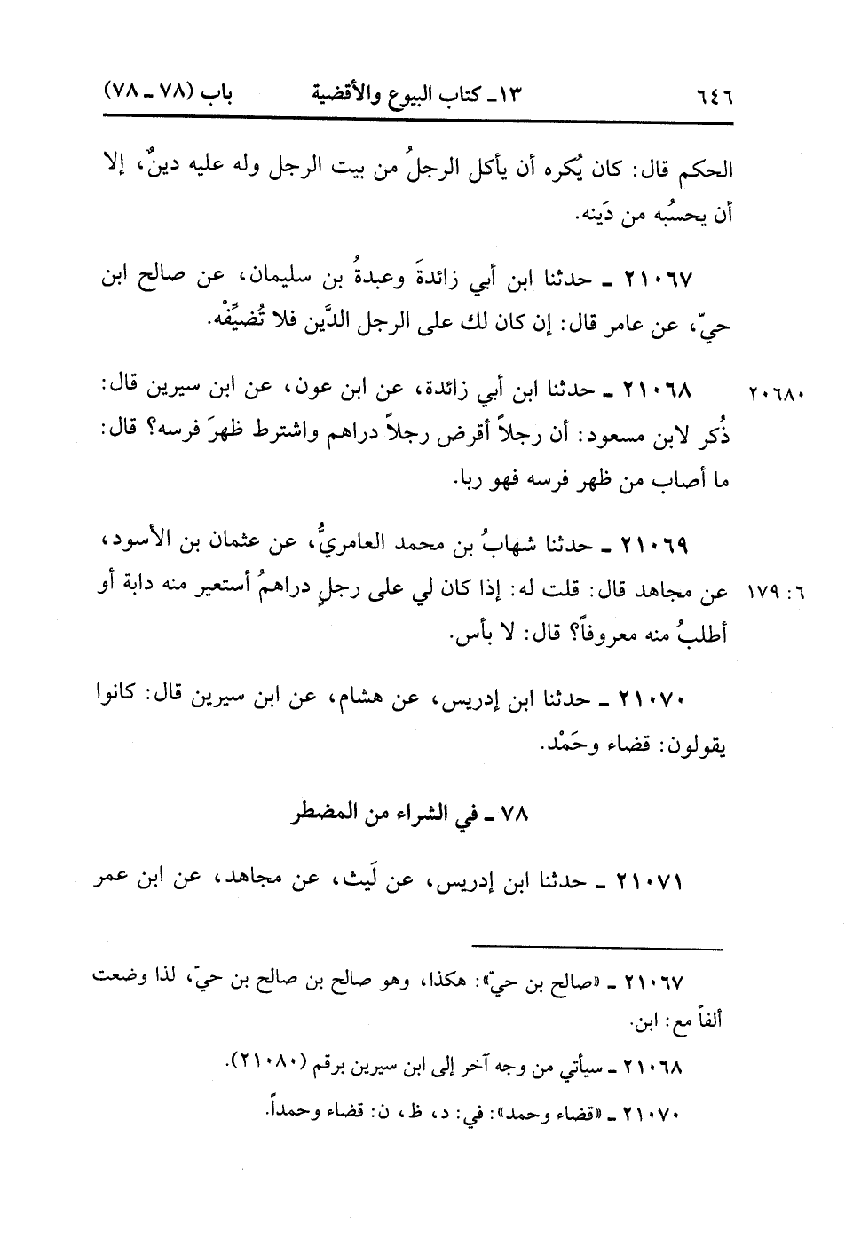21071- حَدَّثَنَا ابْنُ إدْرِيسَ ، عَنْ لَيْثٍ ، عَنْ مُجَاهِدٍ ، عَنِ ابْنِ عُمَرَ ، قَالَ : لاَ تَبتَع مِنْ مُضْطَرٍّ شيئًا. (6/179).
