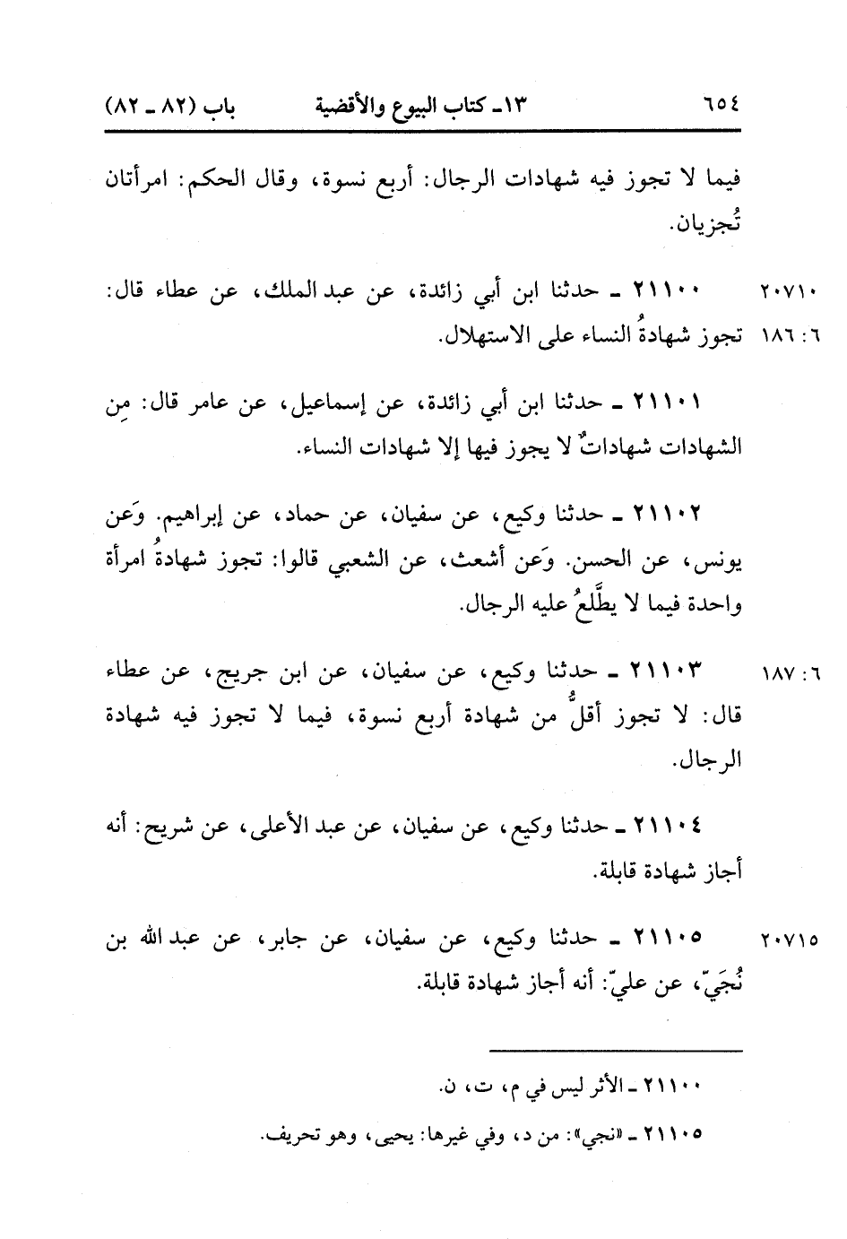 21105- حَدَّثَنَا وَكِيعٌ ، عَنْ سُفْيَانَ ، عَنْ جَابِرٍ ، عَنْ عَبْدِ اللهِ بْنِ نُجَيٍّ ، عَنْ عَلِيٍّ ، أَنَّهُ أَجَازَ شَهَادَةَ قَابِلَةٍ. (6/187).