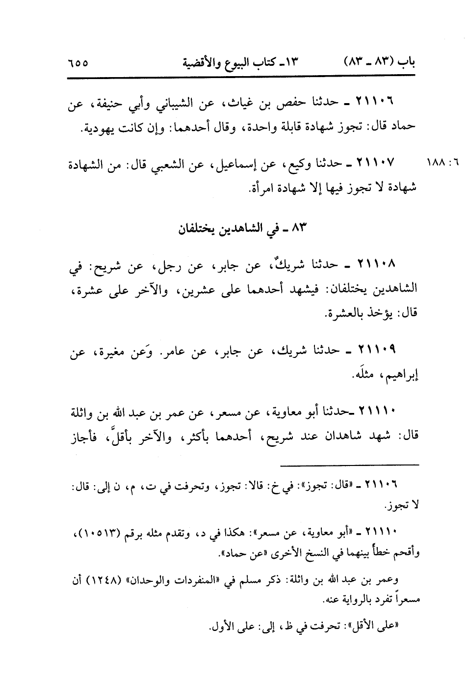 21110- حَدَّثَنَا أَبُو مُعَاوِيَةَ ، عَنْ حَمَّادٍ ، عَنْ مِسْعَرٍ ، عَنْ عُمَرَ بْنِ عَبْدِ اللهِ بْنِ وَاثِلَةَ ، قَالَ : شَهِدَ شَاهِدَانِ عِنْدَ شُرَيْحٍ أَحَدُهُمَا بِأَكْثَرَ وَالآخَرُ بِأَقَلَّ ، فَأَجَازَ شَهَادَتَهُمَا عَلَى الأَقَلِّ. (6/188).
