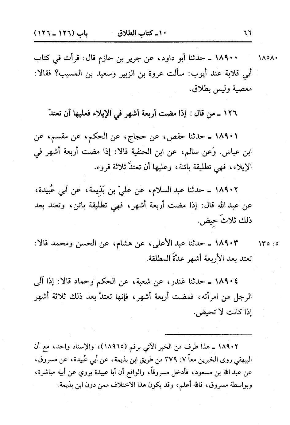 18902- حَدَّثَنَا عَبْدُ السَّلاَمِ ، عَنْ عَلِيِّ بْنِ بَذِيمَةَ ، عَنْ أَبِي عُبَيْدَةَ ، عَنْ عَبْدِ اللهِ قَالَ : إذَا مَضَتْ أَرْبَعَةُ أَشْهُرٍ فَهِيَ تَطْلِيقَةٌ بَائِنٌ ، وَتَعْتَدُّ بَعْدَ ذَلِكَ ثَلاَثَ حِيَضٍ. (5/134).