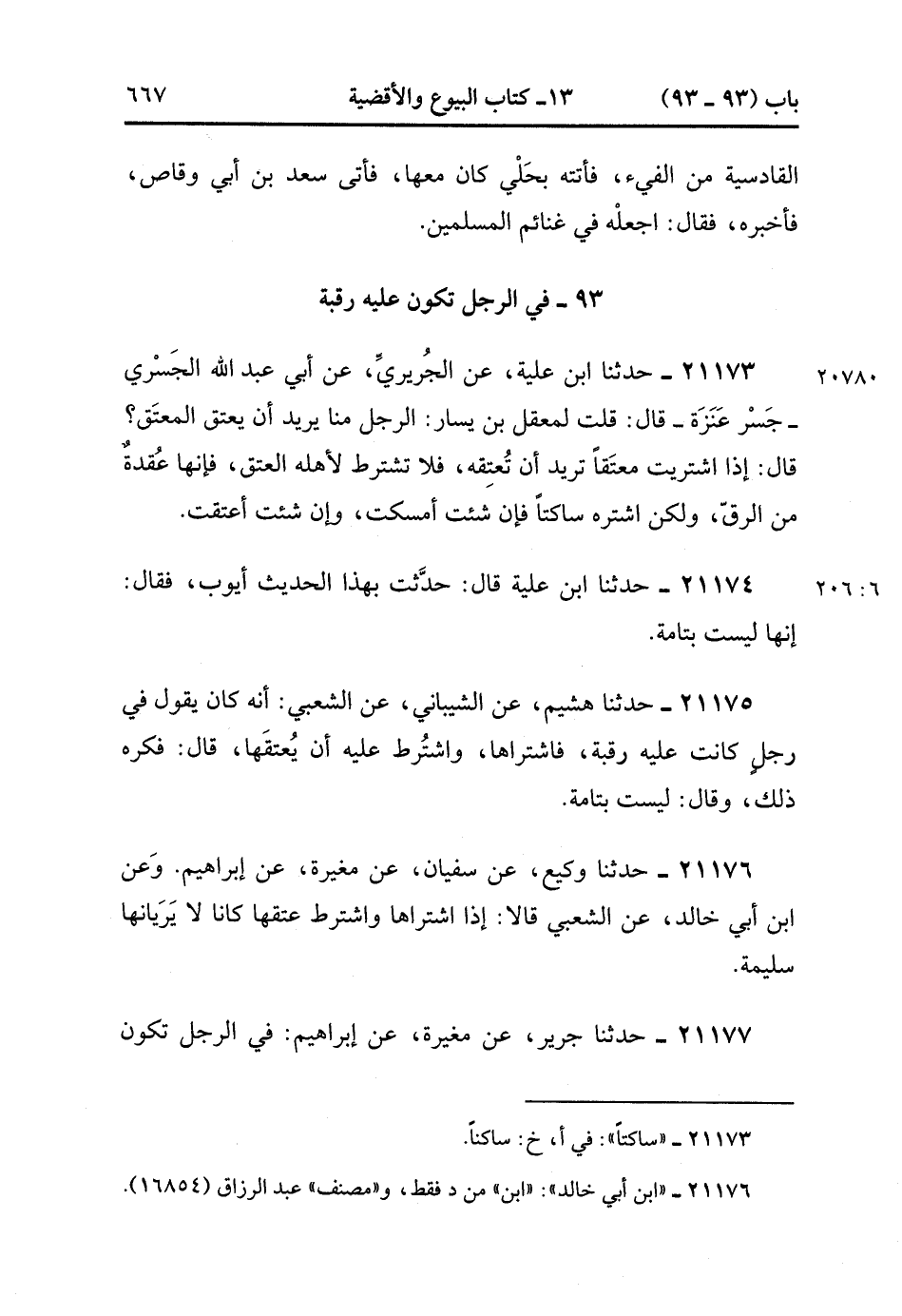 21177- حَدَّثَنَا جَرِيرٌ ، عَنْ مُغِيرَةَ ، عَنْ إبْرَاهِيمَ ؛ فِي الرَّجُلِ تَكُونُ عَلَيْهِ الرَّقَبَةُ الْوَاجِبَةُ فَيَشْتَرِيهَا : فَلاَ يَشْتَرِطْ أَنَّهُ يَشْتَرِيهَا لِلْعِتْقِ. (6/206).