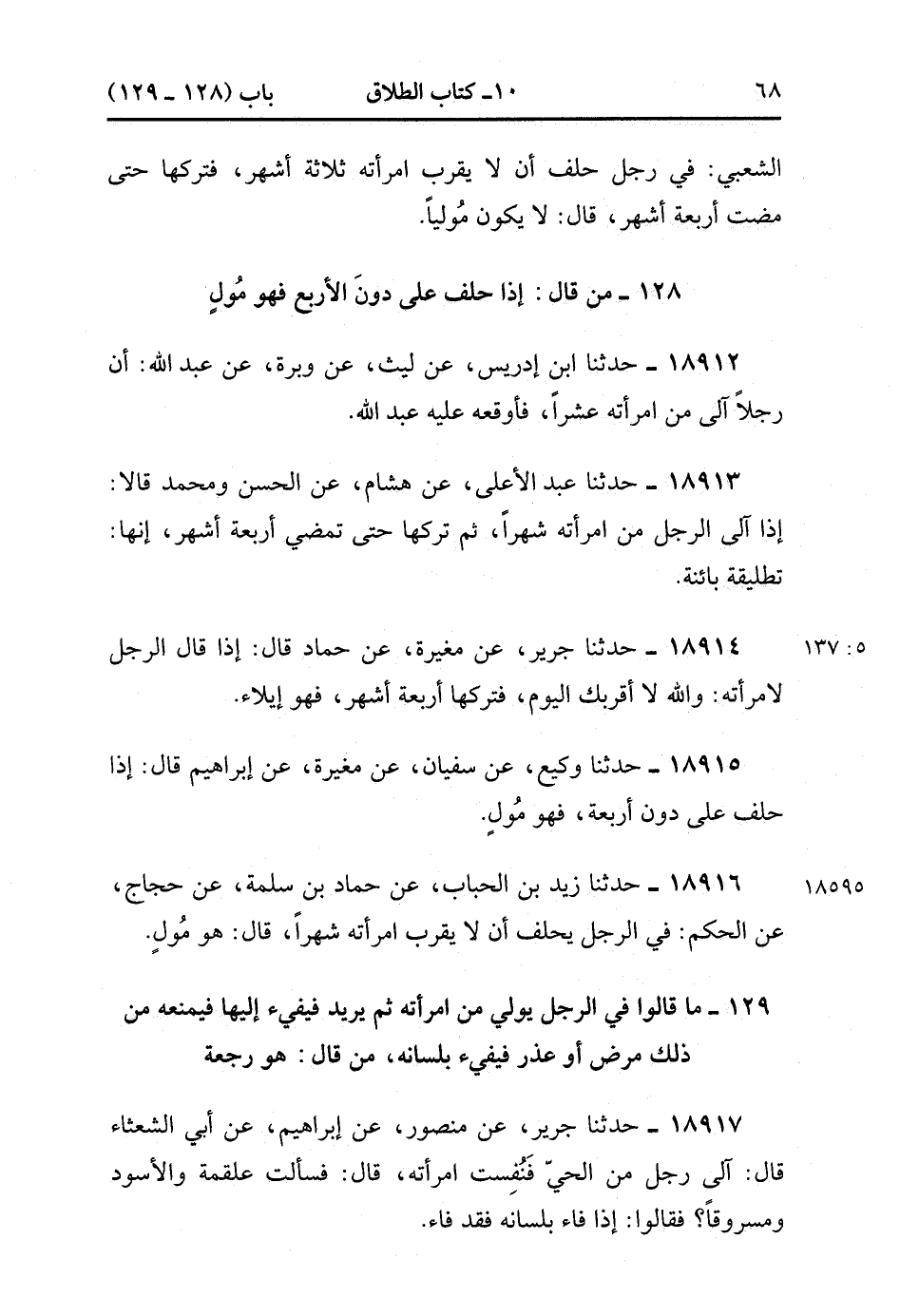 18915- حَدَّثَنَا وَكِيعٌ , عَنْ سُفْيَانَ , عَنْ مُغِيرَةَ ، عَنْ إبْرَاهِيمَ قَالَ : إذَا حَلَفَ عَلَى دُونِ أَرْبَعَةٍ فَهُوَ مُولٍ.