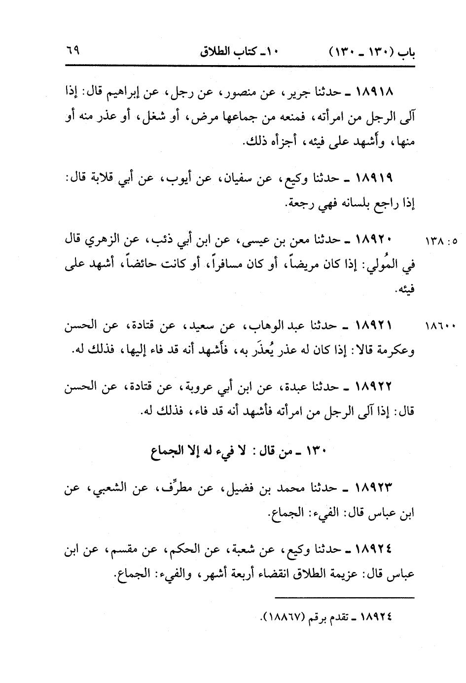 18924- حَدَّثَنَا وَكِيعٌ , عَنْ شُعْبَةَ ، عَنِ الْحَكَمِ , عَنْ مِقْسَمٍ ، عَنِ ابْنِ عَبَّاسٍ قَالَ : عَزِيمَةُ الطَّلاَقِ انْقِضَاءُ أَرْبَعَةِ أَشْهُرٍ وَالْفَيْءُ الْجِمَاعُ. (5/138).