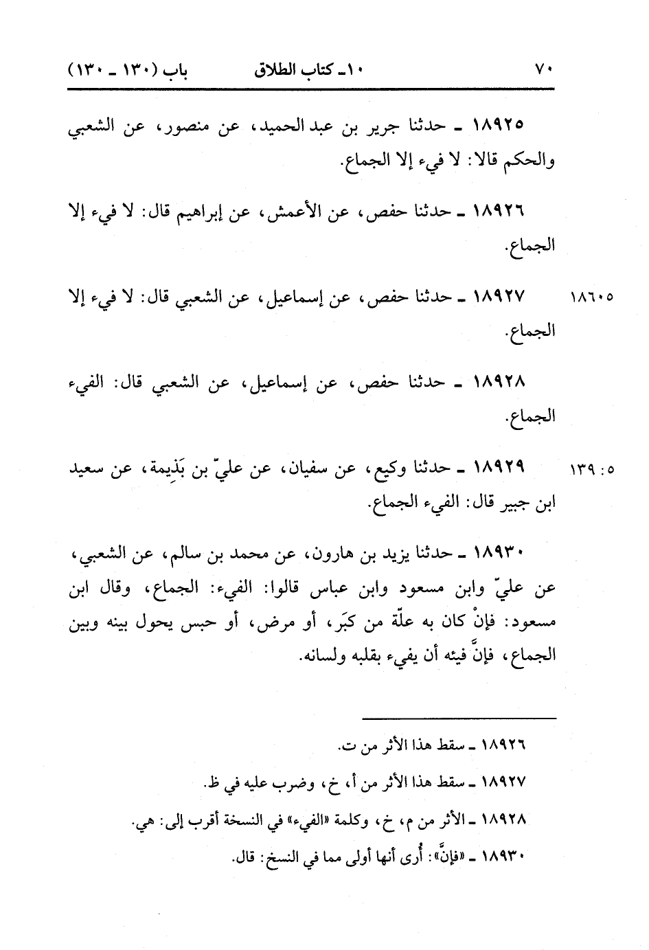 18929- حَدَّثَنَا وَكِيعٌ , عَنْ سُفْيَانَ , عَنْ عَلِيِّ بْنِ بَذِيمَةَ , عَنْ سَعِيدِ بْنِ جُبَيْرٍ قَالَ : الْفَيْءُ الْجِمَاعُ. (5/138).