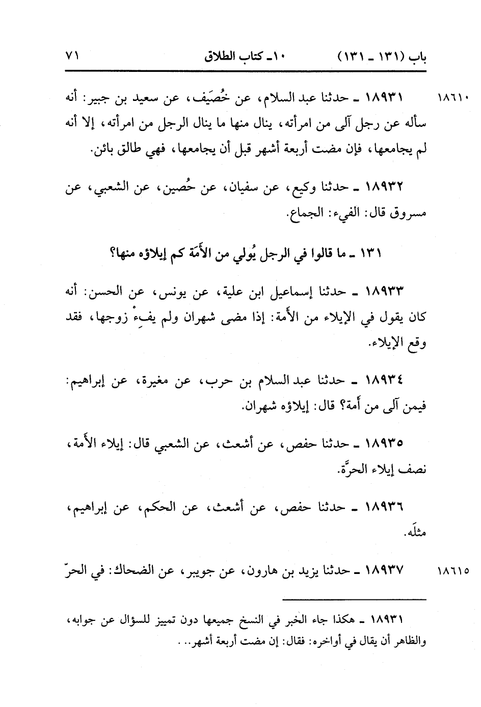 18935- حَدَّثَنَا حَفْصٌ , عَنْ أَشْعَثَ ، عَنِ الشَّعْبِيِّ قَالَ : إِيلاَءُ الأَمَةِ نِصْفُ إِيلاَءُ الْحُرَّةِ.
