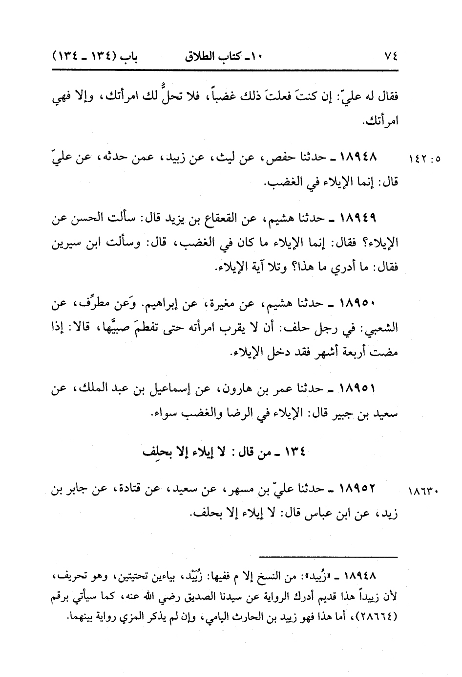 18952- حَدَّثَنَا عَلِيُّ بْنُ مُسْهِرٍ , عَنْ سَعِيدٍ ، عَنْ قَتَادَةَ ، عَنْ جَابِرِ بْنِ زَيْدٍ ، عَنِ ابْنِ عَبَّاسٍ قَالَ : لاَ إيلاَءَ إلاَّ بِحَلِفٍ. (5/142).