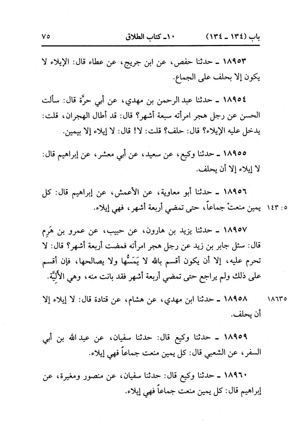 18960- حَدَّثَنَا وَكِيعٌ , قَالَ : حدَّثَنَا سُفْيَانُ , عَنْ مَنْصُورٍ ، وَمُغِيرَةَ , عَنْ إبْرَاهِيمَ قَالَ : كُلُّ يَمِينٍ مَنَعَتْ جِمَاعًا فَهِيَ إيلاَءٌ. (5/143).