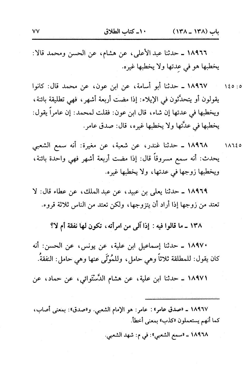 18967- حَدَّثَنَا أَبُو أُسَامَةَ ، عَنِ ابْنِ عَوْنٍ , عَنْ مُحَمَّدٍ قَالَ : كَانُوا يَقُولُونَ ، أَوْ يَتَحَدَّثُونَ فِي الإِيلاَءِ : إذَا مَضَتْ أَرْبَعَةُ أَشْهُرٍ فَهِيَ تَطْلِيقَةٌ بَائِنَةٌ وَيَخْطُبُهَا فِي عِدَّتِهَا إِنْ شَاءَ ، قَالَ ابْنُ عَوْنٍ : فَقُلْت لِمُحَمَّدٍ إنَّ عَامِرًا يَقُولُ : يَخْطُبُهَا فِي عِدَّتِهَا وَلاَ يَخْطُبُهَا غَيْرُهُ ، قَالَ : صَدَقَ عَامِرٌ. (5/144).
