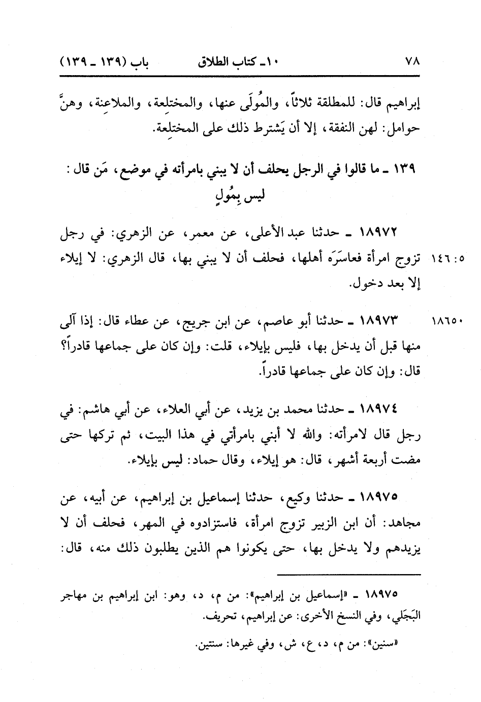 18972- حَدَّثَنَا عَبْدُ الأَعْلَى , عَنْ مَعْمَرٍ ، عَنِ الزُّهْرِيِّ فِي رَجُلٍ تَزَوَّجَ امْرَأَةً فَعَاسَرَهُ أَهْلُهَا فَحَلَفَ أَنْ لاَ يَبْنِيَ بِهَا ، قَالَ الزُّهْرِيُّ : لاَ إيلاَءَ إلاَّ بَعْدَ دُخُولٍ. (5/145).
