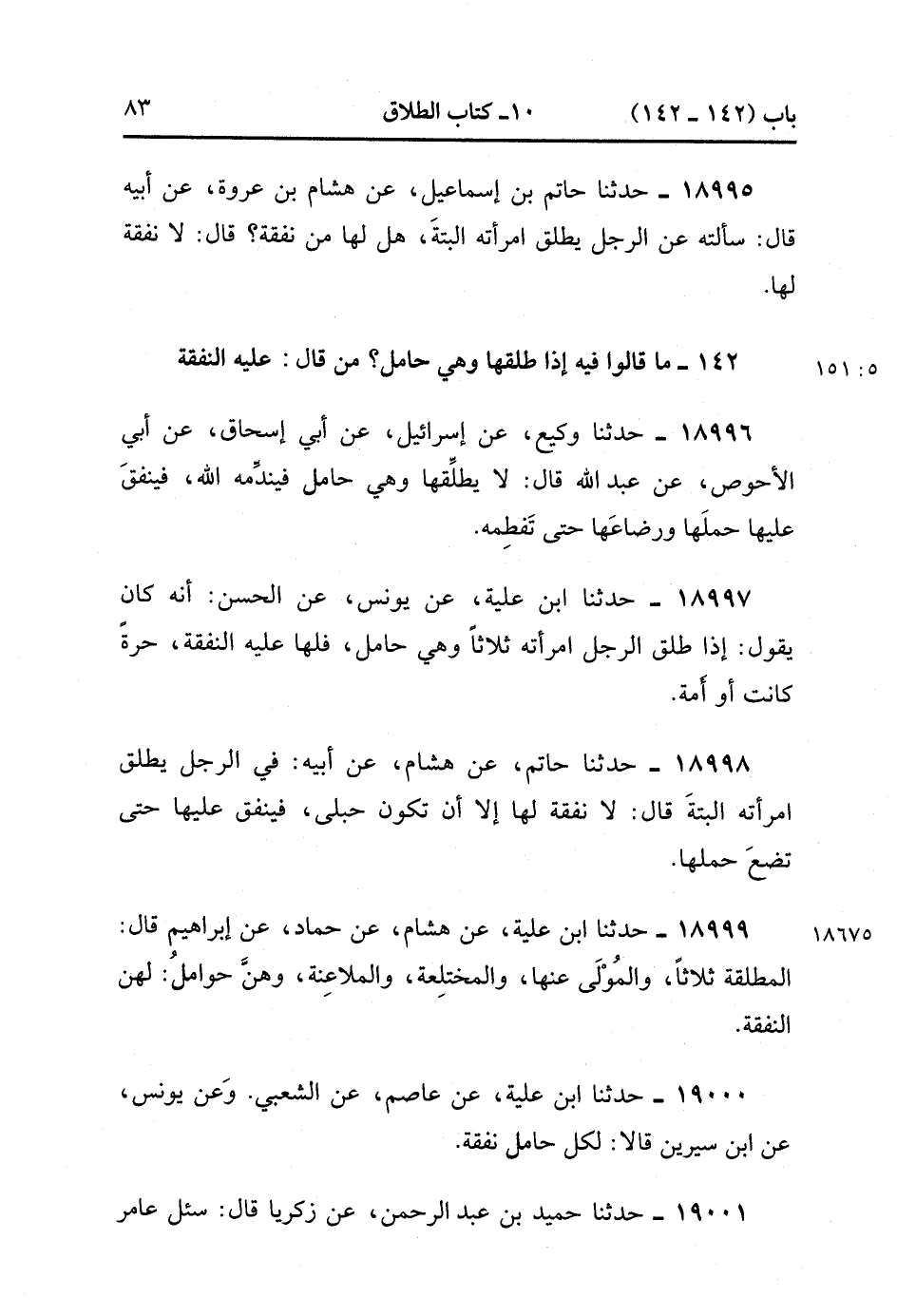 18999- حَدَّثَنَا ابْنُ عُلَيَّةَ , عَنْ هِشَامٍ , عَنْ حَمَّادٍ , عَنْ إبْرَاهِيمَ قَالَ : الْمُطَلَّقَةُ ثَلاَثًا وَالْمُولَى عَنْهَا وَالْمُخْتَلِعَةُ وَالْمُلاَعَنَةُ وَهُنَّ حَوَامِلُ لَهُنَّ النَّفَقَةُ.