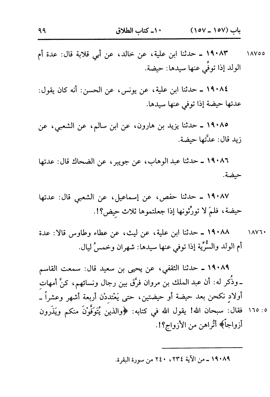 19089- حَدَّثَنَا الثَّقَفِيُّ , عَنْ يَحْيَى بْنِ سَعِيدٍ ، قَالَ : سَمِعْتُ الْقَاسِمَ وَذُكِرَ لَهُ أَنَّ عَبْدَ الْمَلِكِ بْنَ مَرْوَانَ فَرَّقَ بَيْنَ رِجَالٍ وَنِسَائِهِمْ كُنَّ أُمَّهَاتِ أَوْلاَدٍ نُكِحْنَ بَعْدَ حَيْضَةٍ ، أَوْ حَيْضَتَيْنِ حَتَّى يَعْتَدِدْنَ أَرْبَعَةَ أَشْهُرٍ وَعَشْرًا فَقَالَ : سُبْحَانَ اللهِ ، يَقُولُ اللَّهُ فِي كِتَابِهِ : {وَالَّذِينَ يُتَوَفَّوْنَ مِنْكُمْ وَيَذَرُونَ أَزْوَاجًا} أَتُرَهُنَّ مِنَ الأزْوَاج. (5/164).