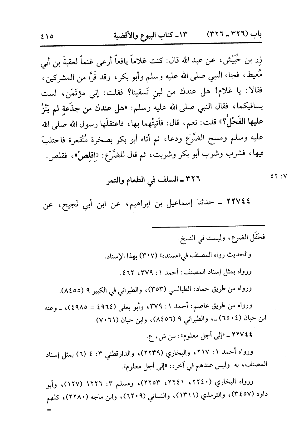 22743- حَدَّثَنَا عَفَّانُ , قَالَ : حدَّثَنَا حَمَّادُ بْنُ سَلَمَةَ ، عَنْ عَاصِمِ ، عَنْ زِرِّ بْنِ حُبَيْشٍ ، عَنْ عَبْدِ اللهِ ، قَالَ : كُنْتُ غُلاَمًا يَافِعًا أَرْعَى غَنَمًا لِعُقْبَةَ بْنِ أَبِي مُعَيْطٍ ، فَجَاءَ النَّبِيُّ صَلَّى الله عَلَيْهِ وَسَلَّمَ وَأَبُو بَكْرٍ ، وَقَدْ فَرَّا مِنَ الْمُشْرِكِينَ ، فَقَالاَ : يَا غُلاَمُ ، هَلْ عِنْدَكَ من لَبَنٍ تَسْقِينَا ، فَقُلْتُ : إنِّي مُؤْتَمَنٌ ، لَسْت سَاقِيَكُمَا ، فَقَالَ النَّبِيُّ صَلَّى الله عَلَيْهِ وَسَلَّمَ : هَلْ عِنْدَكَ مِنْ جَذَعَةٍ لَمْ يَنْزُ عَلَيْهَا الْفَحْلُ ؟ قُلْتُ : نَعَمْ ، قَتالَ : فَأَتَيْتُهُمَا بِهَا ، فَاعْتَقَلَهَا رَسُولُ اللهِ صَلَّى الله عَلَيْهِ وَسَلَّمَ ، وَمَسَحَ الضَّرْعَ وَدَعَا ، ثُمَّ أَتَاهُ أَبُو بَكْر بِصَخْرَةٍ مُنْقَعِرَةٍ ، فَاحْتَلَبَ فِيهَا ، فَشَرِبَ ، وَشَرِبَ أَبُو بَكْرٍ ، وَشَرِبْتُ ، ثُمَّ قَالَ لِلضَّرْعِ : اقْلِصْ ، فَقَلَصَ. (7/51).