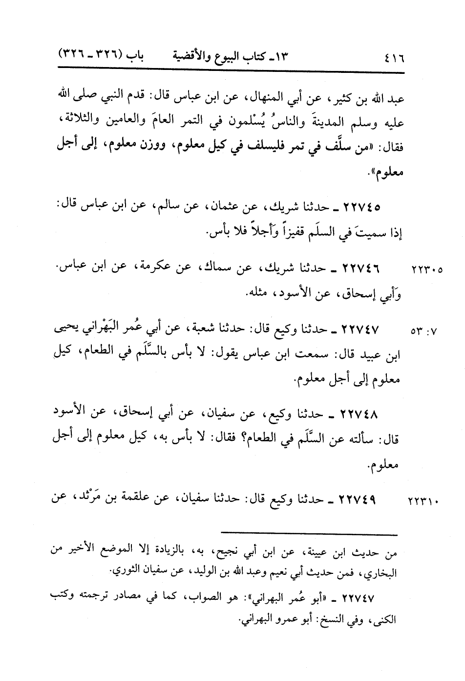 22747- حَدَّثَنَا وَكِيعٌ , قَالَ : حدَّثَنَا شُعْبَةُ ، عَنْ أَبِي عُمَرَ الْبَهْرَانِيِّ يَحْيَى بْنِ عُبَيْدٍ ، قَالَ : سَمِعْتُ ابْنَ عَبَّاسٍ يَقُولُ : لاَ بَأْسَ بِالسَّلَمِ فِي الطَّعَامِ كَيْلاً مَعْلُومًا إلَى أَجَلٍ مَعْلُومٍ. (7/52).
