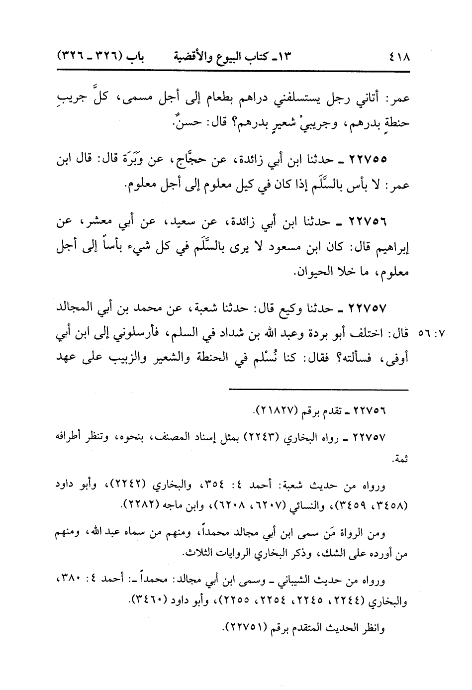 22757- حَدَّثَنَا وَكِيعٌ , قَالَ : حدَّثَنَا شُعْبَةُ ، عَنْ مُحَمَّدِ بْنِ أَبِي الْمُجَالِدِ ، قَالَ : اخْتَلَفَ أَبُو بُرْدَةَ وَعَبْدُ اللهِ بْنُ شَدَّادٍ فِي السَّلَمِ ، فَأَرْسَلُونِي إلَى ابْنِ أَبِي أَوْفَى فَسَأَلْتُهُ ؟ فَقَالَ : كُنَّا نُسْلِمُ فِي الْحِنْطَةِ وَالشَّعِيرِ وَالزَّبِيبِ عَلَى عَهْدِ النَّبِيِّ صَلَّى الله عَلَيْهِ وَسَلَّمَ ، وَأَبِي بَكْرٍ ، وَلاَ نَدْرِي عِنْدَ أَصْحَابِهِ مِنْهُ شَيْءٌ أَمْ لاَ ؟. (7/55).