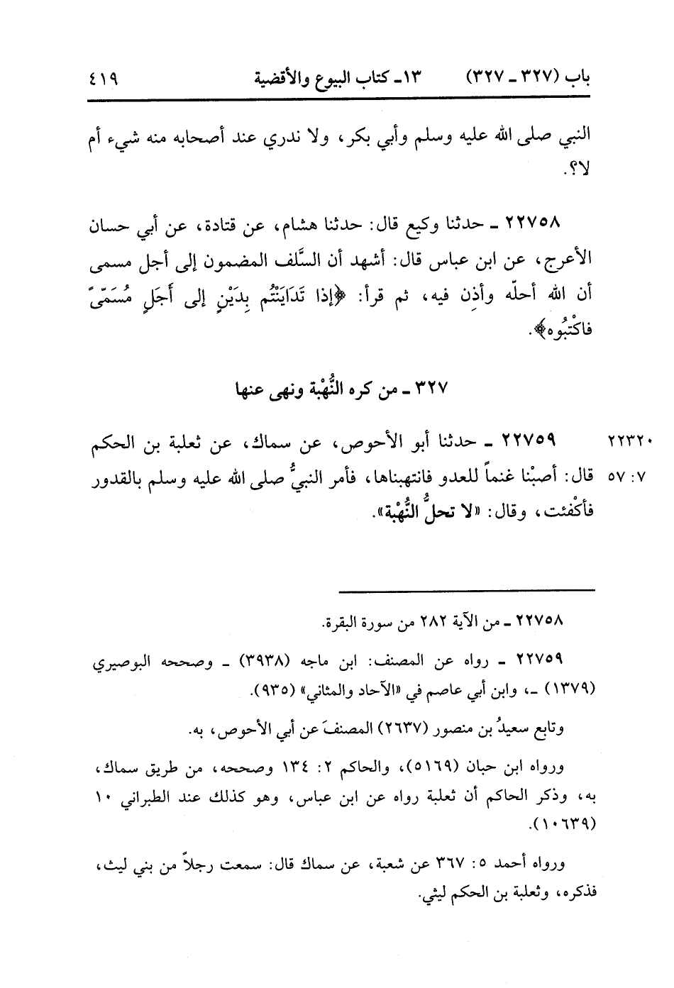22759- حَدَّثَنَا أَبُو الأَحْوَصِ ، عَنْ سِمَاكٍ ، عَنْ ثَعْلَبَةَ بْنِ الْحَكَمِ ، قَالَ : أَصَبْنَا غَنَمًا لِلْعَدُوِّ فَانْتَهَبْنَاهَا ، فَأَمَرَ النَّبِيُّ صَلَّى الله عَلَيْهِ وَسَلَّمَ بِالْقُدُورِ فَأُكْفِئَتْ وَقَالَ : لاَ تَحِلُّ النُّهْبَةُ. (7/56).