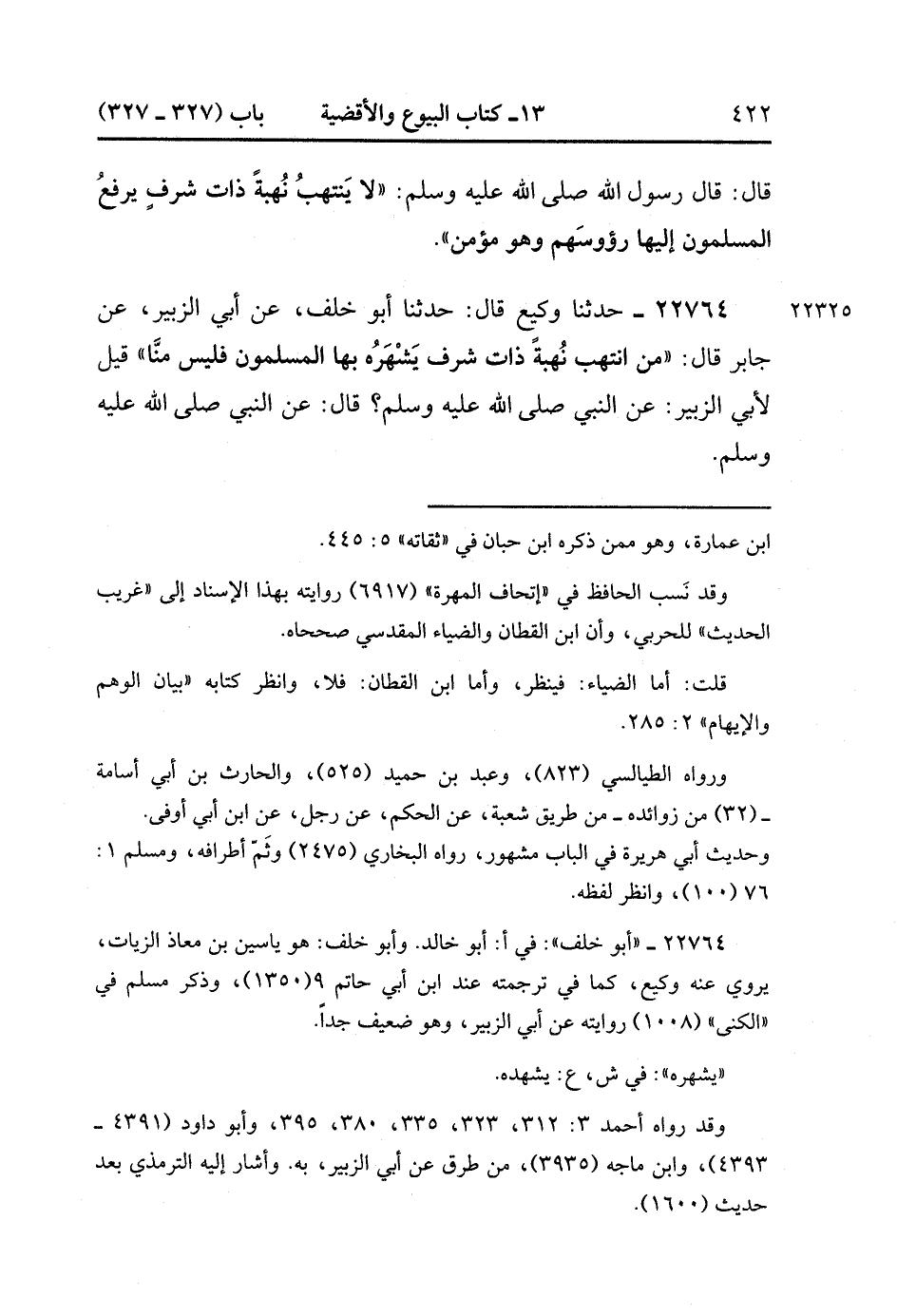 22764- حَدَّثَنَا وَكِيعٌ , قَالَ : حدَّثَنَا أَبُو خَلَفٍ (1)، عَنْ أَبِي الزُّبَيْرِ ، عَنْ جَابِرٍ ، قَالَ : مَنِ انْتَهَبَ نُهْبَةً ذَاتَ شَرَفٍ يَشْهَرُهُ بِهَا الْمُسْلِمُونَ فَلَيْسَ مِنَّا ، قِيلَ لأَِبِي الزُّبَيْرِ : عَنِ النَّبِيِّ صَلَّى الله عَلَيْهِ وَسَلَّمَ ؟ قَالَ : عَنِ النَّبِيِّ صَلَّى الله عَلَيْهِ وَسَلَّمَ. (7/58).