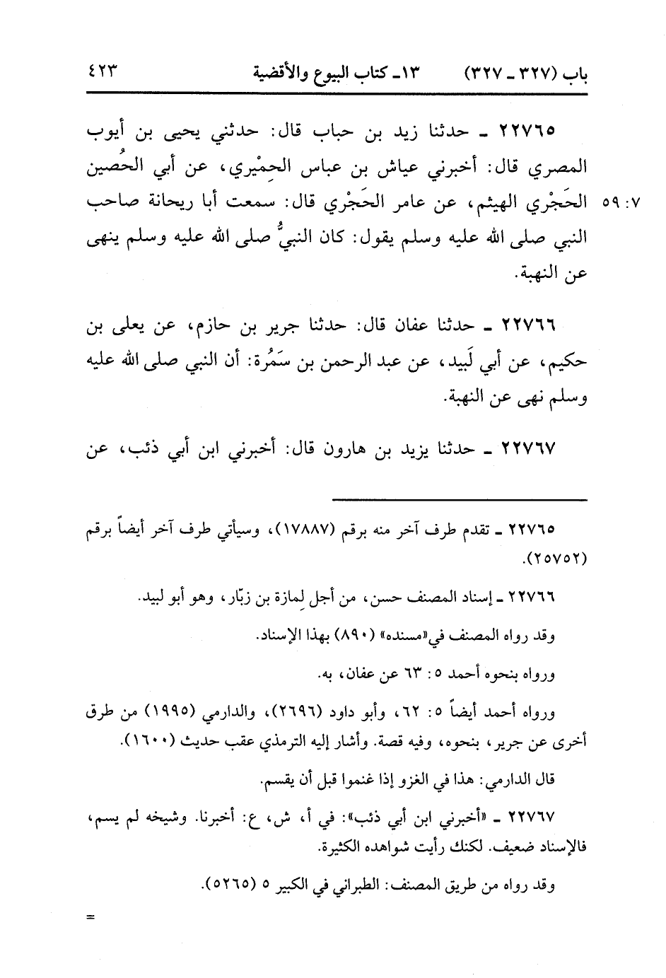 22765- حَدَّثَنَا زَيْدُ بْنُ حُبَابٍ ، قَالَ : حدَّثَنِي يَحْيَى بْنُ أَيُّوبَ الْمِصْرِيُّ ، قَالَ : أَخْبَرَنِي عَيَّاشُ بْنُ عَبَّاسٍ الْحِمْيَرِيُّ ، عَنْ أَبِي الْحُصَيْنِ الْحَجْرِيِّ الْهَيْثَمِ ، عَنْ عَامِرِ الْحَجْرِيِّ ، قَالَ : سَمِعْتُ أَبَا رَيْحَانَةَ صَاحِبَ النَّبِيِّ صَلَّى الله عَلَيْهِ وَسَلَّمَ يَقُولُ : كَانَ النَّبِيُّ صَلَّى الله عَلَيْهِ وَسَلَّمَ يَنْهَى عَنِ النُّهْبَةِ.(7/58).