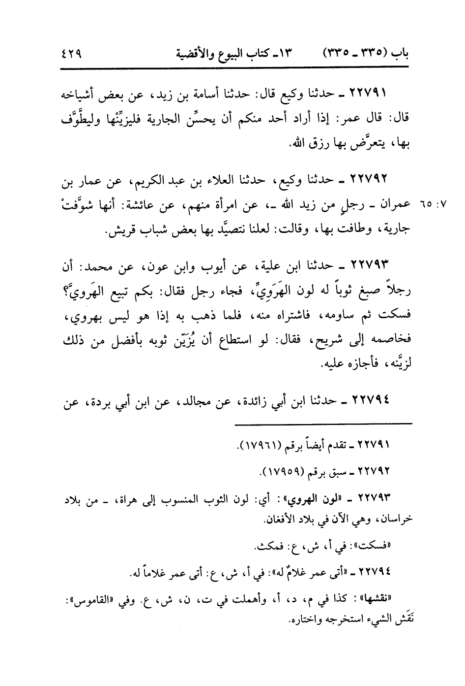 22792- حَدَّثَنَا وَكِيعٌ , قَالَ : حدَّثَنَا الْعَلاَءُ بْنُ عَبْدِ الْكَرِيمِ ، عَنْ عَمَّارِ بْنِ عِمْرَانَ رَجُلٍ مِنْ زَيْدِ اللهِ ، عَنِ امْرَأَةٍ مِنْهُمْ ، عَنْ عَائِشَةَ : أَنَّهَا شَوَّفَتْ جَارِيَةً وَطَافَتْ بِهَا وَقَالَتْ : لَعَلَّنَا نَتَصَيَّد بِهَا بَعْضَ شَبَابِ قُرَيْشٍ. (7/64).