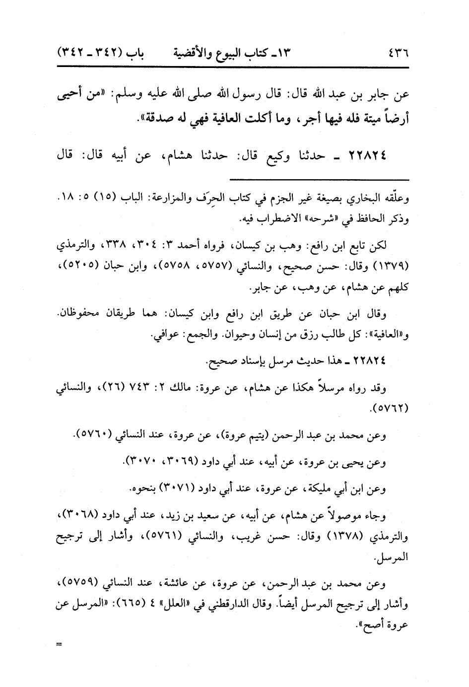 22823- حَدَّثَنَا وَكِيعٌ , قَالَ : حدَّثَنَا هِشَامُ بْنُ عُرْوَةَ ، عَنِ ابْنِ رَافِعٍ ، عَنْ جَابِرِ بْنِ عَبْدِ اللهِ ، قَالَ : قَالَ رَسُولُ اللهِ صَلَّى الله عَلَيْهِ وَسَلَّمَ : مَنْ أَحْيَى أَرْضًا مَيْتَةً فَلَهُ فِيهَا أَجْرٌ ، وَمَا أَكَلَتِ الْعَافِيَةُ فَهِي لَهُ صَدَقَةٌ.