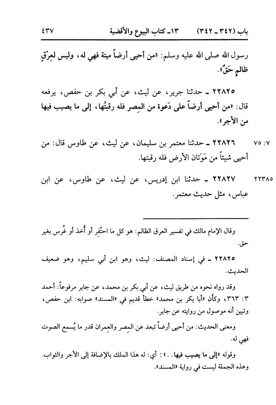 22825- حَدَّثَنَا جَرِيرٌ ، عَنْ لَيْثٍ ، عَنْ أَبِي بَكْرٍ بْنِ حَفْصٍ ، يَرْفَعُهُ ، قَالَ : مَنْ أَحْيَى أَرْضًا عَلَى دَعْوَةٍ مِنَ الْمِصْرِ فَلَهُ رَقَبَتُهَا إلَى مَا يُصِيبُ فِيهَا مِنَ الأَجْرِ. (7/74).