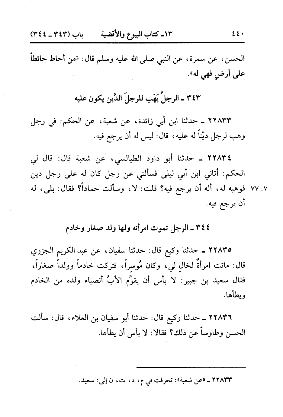 22834- حَدَّثَنَا أَبُو دَاوُدَ الطَّيَالِسِيُّ ، عَنْ شُعْبَةَ ، قَالَ : قَالَ لِي الْحَكَمُ : أَتَانِي ابْنُ أَبِي لَيْلَى فَسَأَلَنِي عَنْ رَجُلٍ كَانَ لَهُ عَلَى رَجُلٍ دَيْنٌ فَوَهَبَهُ لَهُ ، أَلَهُ أَنْ يَرْجِعَ فِيهِ ؟ قُلْتُ : لاَ. وَسَأَلْت حَمَّادًا فَقَالَ : بَلَى ، لَهُ أَنْ يَرْجِعَ فِيهِ. (7/76).