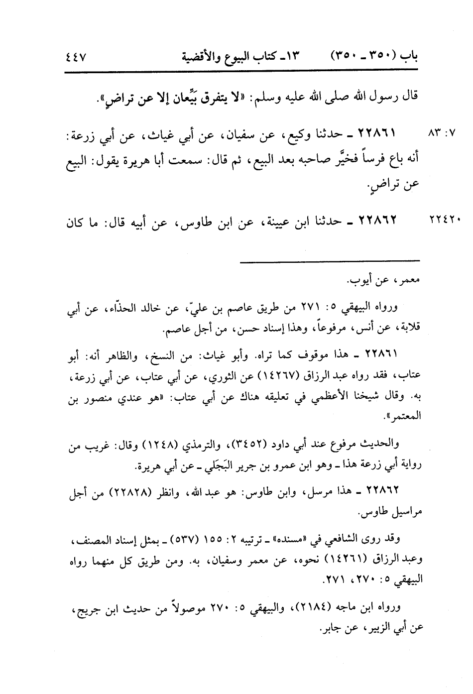 22860- حَدَّثَنَا إسْمَاعِيلُ ابْنُ عُلَيَّةَ ، عَنْ أَيُّوبَ ، عَنْ أَبِي قِلاَبَةَ ، قَالَ : قَالَ رَسُولُ اللهِ صَلَّى الله عَلَيْهِ وَسَلَّمَ : لاَ يَتَفَرَّقُ بَيِّعَانِ إلاَّ عَنْ تَرَاضٍ. (7/82).
