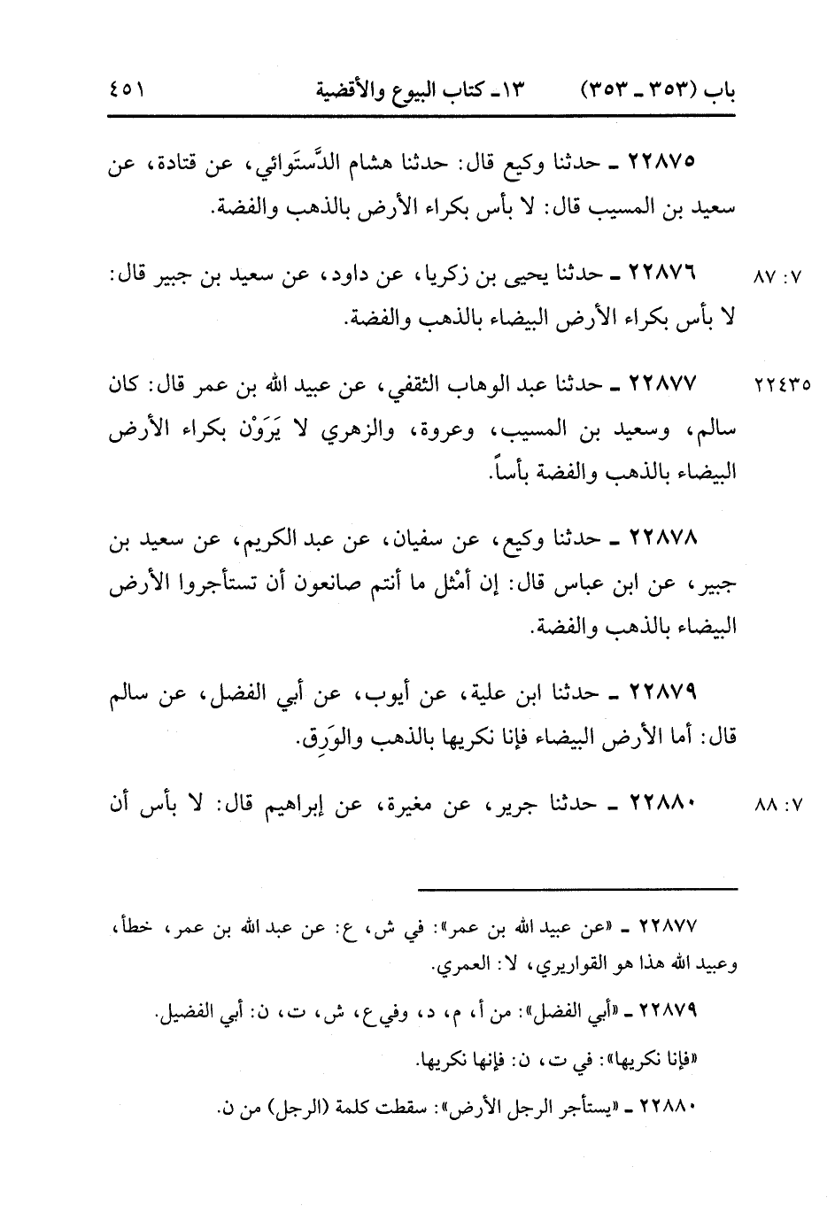 22877- حَدَّثَنَا عَبْدُ الْوَهَّابِ الثَّقَفِيُّ ، عَنْ عُبَيْدِ اللهِ بْنِ عُمَرَ ، قَالَ : كَانَ سَالِمٌ وَسَعِيدُ بْنُ الْمُسَيَّبِ وَعُرْوَةُ وَالزُّهْرِيُّ لاَ يَرَوْنَ بِكِرَاءِ الأَرْضِ الْبَيْضَاءِ بِالذَّهَبِ وَالْفِضَّةِ بَأْسًا.