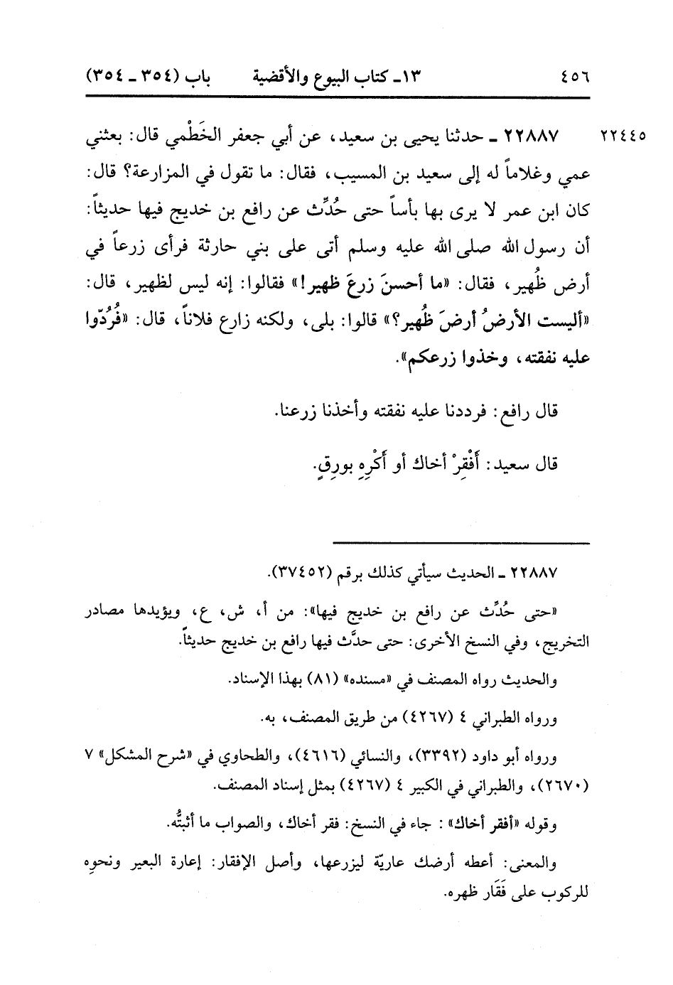 22887- حَدَّثَنَا يَحْيَى بْنُ سَعِيدٍ ، عَنْ أَبِي جَعْفَرٍ الْخَطْمِيِّ ، قَالَ : بَعَثَنِي عَمِّي وَغُلاَمًا لَهُ إلَى سَعِيدِ بْنِ الْمُسَيَّبِ فَقَالَ : مَا تَقُولُ فِي الْمُزَارَعَةِ ؟ قَالَ : كَانَ ابْنُ عُمَرَ لاَ يَرَى بِهَا بَأْسًا حَتَّى حُدِّثَ عَنْ رَافِعِ بْنِ خَدِيجٍ فِيهَا حَدِيثًا ، أَنَّ رَسُولَ اللهِ صَلَّى الله عَلَيْهِ وَسَلَّمَ أَتَى عَلَى بَنِي حَارِثَةَ فَرَأَى زَرْعًا فِي أَرْضِ ظُهَيْرٍ ، فَقَالَ : مَا أَحْسَنَ زَرْعَ ظُهَيْرٍ ، فَقَالُوا : إِنَّهُ لَيْسَ لِظُهَيْرٍ ، قَالَ : أَلَيْسَتِ الأَرْضُ أَرْضَ ظُهَيْرٍ ؟ قَالُوا : بَلَى وَلَكِنَّهُ زَارَعَ فُلاَنًا ، قَالَ : فَرُدُّوا عَلَيْهِ نَفَقَتَهُ وَخُذُوا زَرْعَكُمْ ،