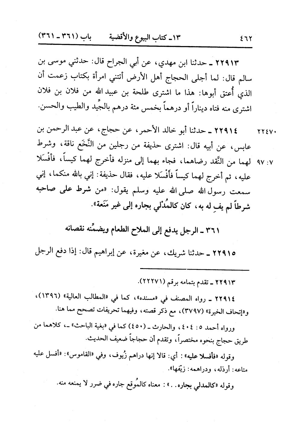 22914- حَدَّثَنَا أَبُو خَالِدٍ الأَحْمَرِِ ، عَنْ حَجَّاجِ ، عَنْ عَبْدِ الرَّحْمَنِ بْنِ عَابِسٍ ، عَنْ أَبِيهِ ، قَالَ : اشْتَرَى حُذَيْفَةُ مِنْ رَجُلَيْنِ مِنَ النَّخَعِ نَاقَةً ، وشرط لهما من النقد رضاهما ، فَجَاءَ بِهِمَا فِي مَنْزِلِهِ فَأَخْرَجَ لَهُمَا كِيساً فأفسلا عَلَيْهِ ، ثُمَّ أخرج لهما كيسًا فأفسلا عليه ، فَقَالَ حُذَيْفَةُ : إنِّي بِاللَّهِ مِنْكُمَا ، إنِّي سَمِعْتُ رَسُولَ اللهِ صَلَّى الله عَلَيْهِ وَسَلَّمَ يَقُولُ : مَنْ شَرَطَ عَلَى صَاحِبِهِ شَرْطًا لَمْ يَفِ لَهُ بِهِ ، كَانَ كَالْمُدْلِي بجاره إلَى غَيْرِ منعة. (7/96).