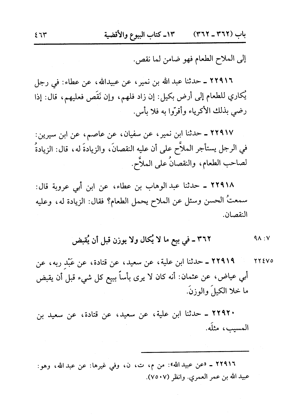 22920- حَدَّثَنَا ابْنُ عُلَيَّةَ ، عَنْ سَعِيدٍ ، عَنْ قَتَادَةَ ، عَنْ سَعِيدِ بْنِ الْمُسَيَّبِ ، مِثْلَهُ. (7/98).