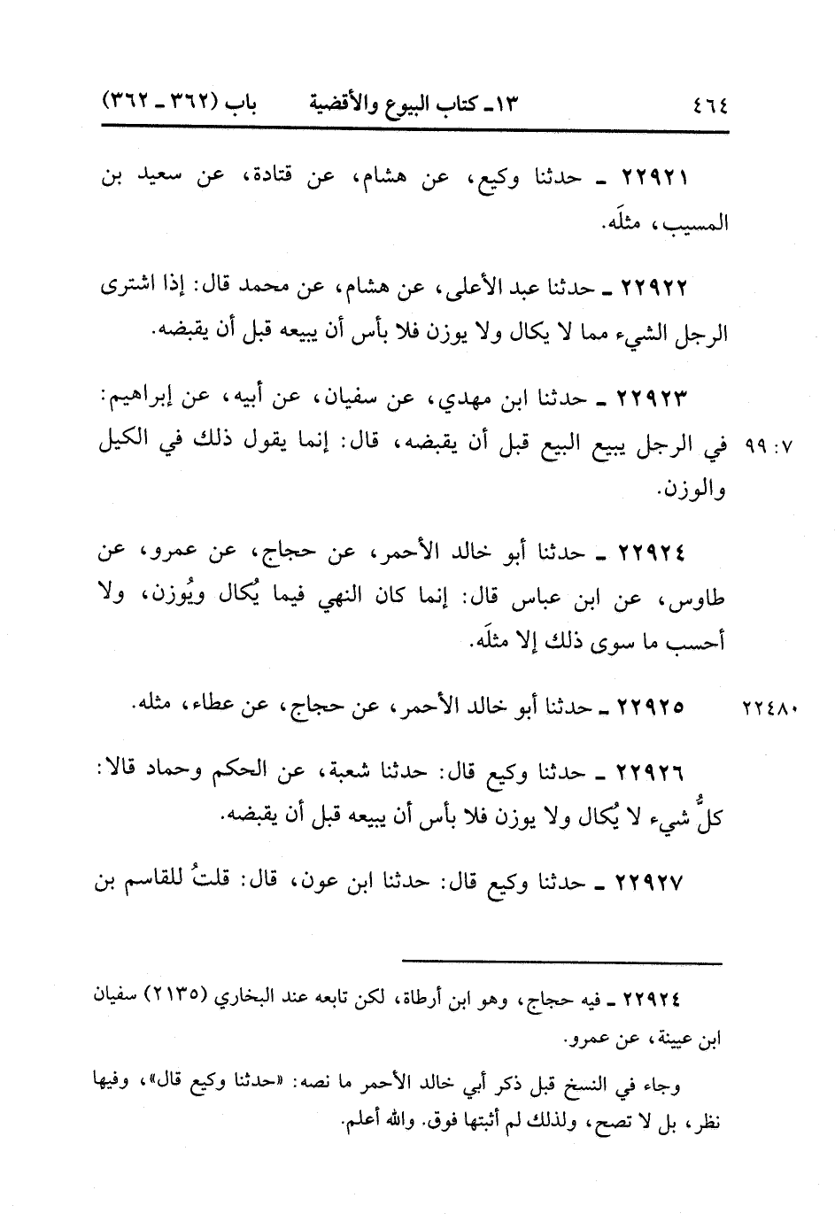 22926- حَدَّثَنَا وَكِيعٌ , قَالَ : حدَّثَنَا شُعْبَةُ ، عَنِ الْحَكَمِ وَحَمَّادٍ ، قَالاَ : كُلُّ شَيْءٍ لاَ يُكَالُ وَلاَ يُوزَنُ فَلاَ بَأْسَ أَنْ يَبِيعَهُ قَبْلَ أَنْ يَقْبِضَهُ. (7/99).