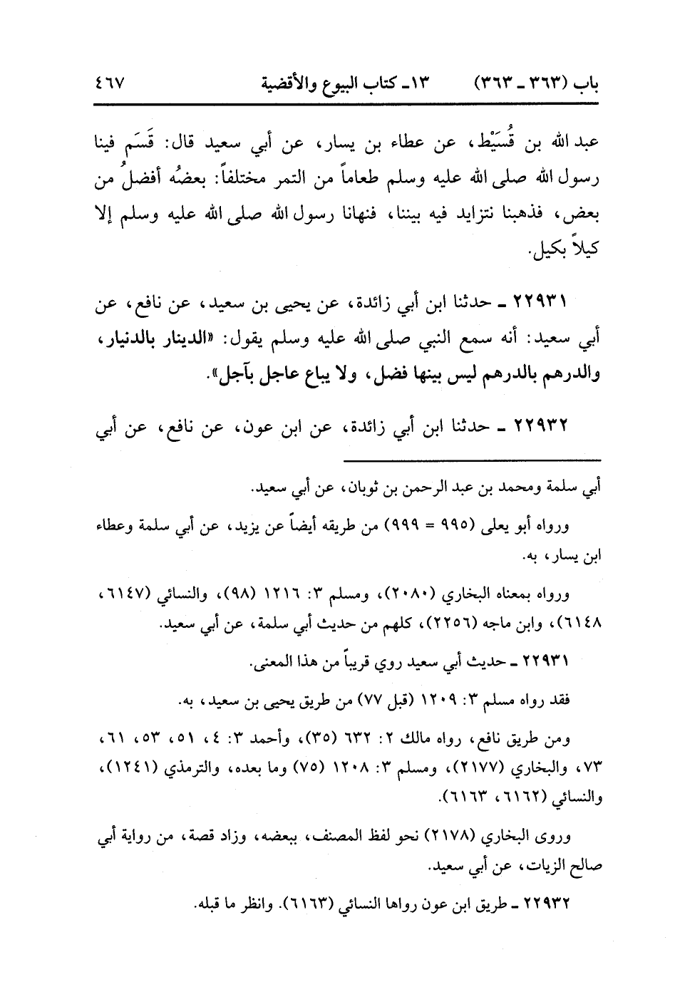 22931- حَدَّثَنَا ابْنُ أَبِي زَائِدَةَ ، عَنْ يَحْيَى بْنِ سَعِيدٍ ، عَنْ نَافِعٍ ، عَنْ أَبِي سَعِيدٍ : أَنَّهُ سَمِعَ النَّبِيَّ صَلَّى الله عَلَيْهِ وَسَلَّمَ يَقُولُ : الدِّينَارُ بِالدِّينَارِ وَالدِّرْهَمُ بِالدِّرْهَمِ لَيْسَ بَيْنَها فَضْلٌ ، وَلاَ يُبَاعُ عَاجِلٌ بِآجِلٍ. (7/101).