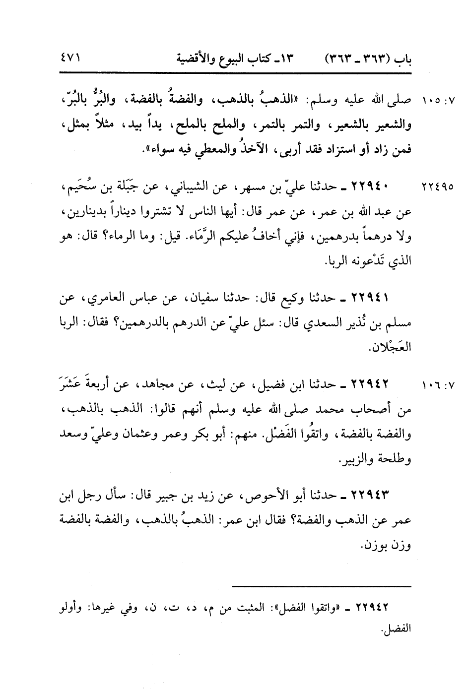 22943- حَدَّثَنَا أَبُو الأَحْوَصِ ، عَنْ زَيْدِ بْنِ جُبَيْرٍ ، قَالَ : سَأَلَ رَجُلٌ ابْنَ عُمَرَ عَنِ الذَّهَبِ وَالْفِضَّةِ فَقَالَ ابْنُ عُمَرَ : الذَّهَبُ بِالذَّهَبِ ، وَالْفِضَّةُ بِالْفِضَّةِ وَزْنٌ بِوَزْنٍ. (7/106).