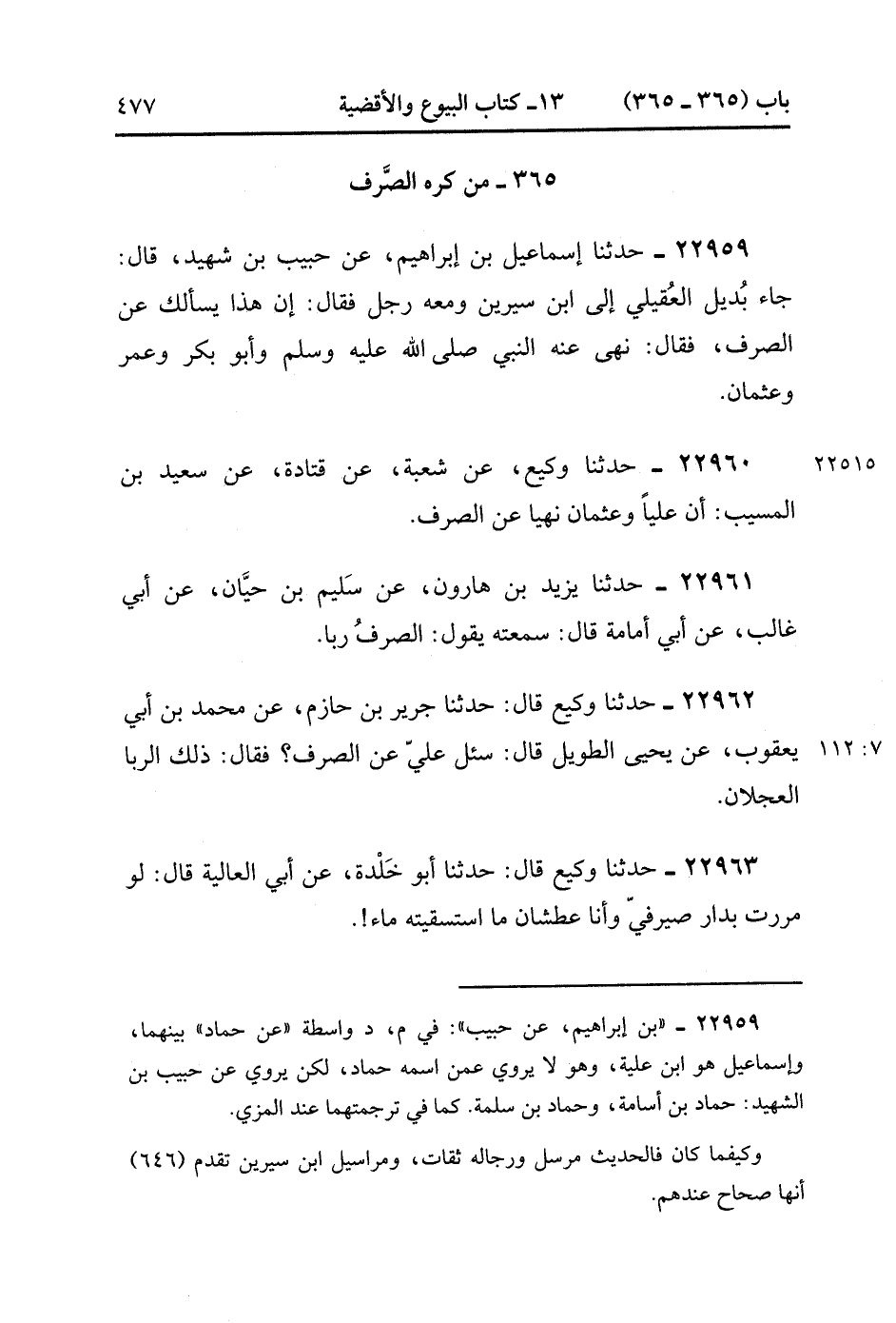 22959- حَدَّثَنَا إسْمَاعِيلُ بْنُ إِبْرَاهِيمَ ، عَنْ حَبِيبِ بْنِ شَهِيدٍ ، قَالَ : جَاءَ بُدَيل الْعُقَيْلِيُّ إلَى ابْنِ سِيرِينَ وَمَعَهُ رَجُلٌ فَقَالَ : إنَّ هَذَا يَسْأَلُك عَنِ الصَّرْفِ ، فَقَالَ : نَهَى عَنْهُ النَّبِيُّ صَلَّى الله عَلَيْهِ وَسَلَّمَ ، وَأَبُو بَكْرٍ وَعُمَرُ وَعُثْمَانُ.